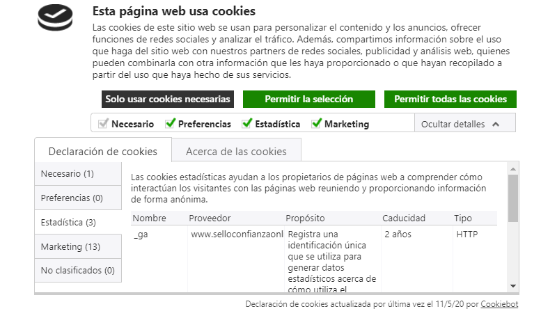 Prestafan33 Posted May 22, 2020 Share Posted May 22, 2020 (edited) Buenos días. Estoy buscando un módulo de cookies que permita lo que piden los de Confianza Online, que básicamente es que muestre un panel antes de instalar ninguna cookie, donde se presenten todas las que existen en el sitio web, agrupadas por finalidad, y que permita al usuario desactivar unas u otras, por ejemplo, habilitar las analíticas y deshabilitar las publicitarias, o viceversa. Yo he estado mirando en la tienda de módulos y no he encontrado nada parecido. Es más, me parece extremadamente difícil hacer algo así para Prestashop, ya que implica un sistema de desactivación de módulos "a la carta" (a ti te habilito el módulo de Analytics de Google, a ti te desactivo el módulo de seguimiento de Pixel de Facebook, etc). Todo eso gestionado por otro módulo, que sería el que "mandase" sobre ellos, y que tendría que presentarse al inicio, bloqueando al resto hasta que el usuario haga su elección. Aparte de que los módulos sobre los que opera son módulos de terceros la mayoría, que no están preparados para funcionar de este modo (y, desde luego, no voy a modificarlos uno a uno para que lo hagan). Por eso pregunto si alguien conoce un módulo que haga esto, o si directamente lo que están pidiendo, hoy por hoy, es imposible en Prestashop tal y como está diseñado el software. Por ejemplo, esto es lo que tienen ellos en su web (que, evidentemente, no es un Prestashop): Edito y añado: Lo curioso de su selector de cookies ¡es que no funciona!. Selecciones lo que selecciones, te las instala igual. Yo he desmarcado todas (excepto las necesarias, que no se pueden desmarcar), y aún así, según el navegador, me ha metido las de google, entre muchas otras. Así que da toda la impresión de que mucha apariencia y poca funcionalidad... Edited May 22, 2020 by Prestafan33 (see edit history) Link to comment Share on other sites More sharing options...