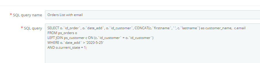 idnovate.com Posted June 6, 2020 Share Posted June 6, 2020 Try this: SELECT o.`id_order`, o.`date_add`, o.`id_customer`, CONCAT(c.`firstname`, ' ', c.`lastname`) as customer_name, c.email FROM ps_orders o LEFT JOIN ps_customer c ON (c.`id_customer` = o.`id_customer`) WHERE o.`date_add` > '2020-5-25' AND o.current_state = 1; //Set the ID for Delivered order state Link to comment Share on other sites More sharing options...