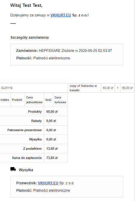 Potrzebuje pomocy :( Grafika w mailu potwierdzenia zamówienia u mnie się rozwala. Pozycje produkty są wysunięte przed tabelą i dlatego cała tabela została skurczona pod spodem. Wydaje mi się, że to powstało jak edytowałem w międzynarodowy/tłumaczenia/tłum acznia e-maila/treść/classic. W order_conf zmieniłem błędny zapis "Zapłacono w sumie" na poprawny "suma do zapłacenia".