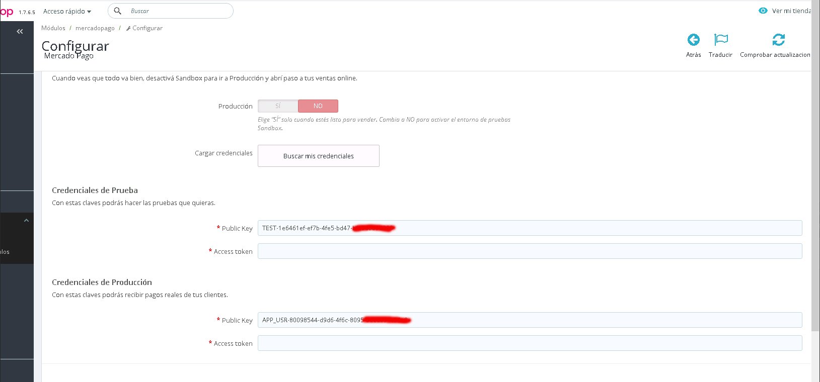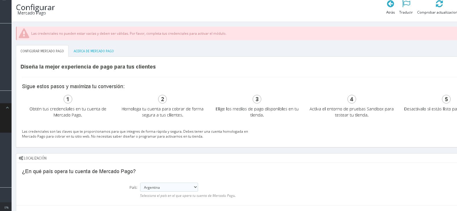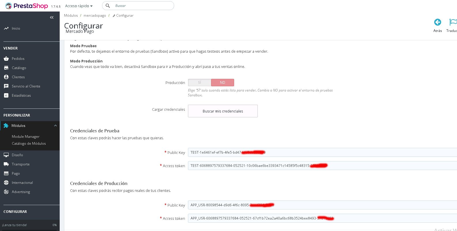 PrestAlec Posted November 7, 2020 Share Posted November 7, 2020 On 5/25/2020 at 6:59 PM, pfontana2014 said: Hola, hemos instalado Prestashop 1.7.6.5, todo perfecto, tenemos dificultades cuando queremos activar el módulo de MercadoPago. El módulo lo hemos bajado tanto de developers de MercadoPago como de Prestashop se supone que deberia ser la version que funcione en PS 1.7 La instalación del módulo es correcta pero al configurar, las credenciales de prueba y de produccion nos dice que las mismas no pueden estar vacias y deben ser validas. Las credenciales son las que nos devuelve MercadoPago una vez logueado en la opción Credenciales, hemos incluso intentado revonar las credenciales con el mismo resultado. Aqui van las imagenes cuando hacemos la primer parte de la configuracion cargando los datos (imagen1) Dos imagenes luego de darle Guardar, la primera que el error que produce y la otra como quedan los campos de Access Token que los devuelve vacios luego de darle Guardar Investigamos vimos que alguien tenia un problema igual con Wampp y lo resolvio instalando Xampp. En nuestro caso esta corriendo con Windows Server 2008 R2 Data Center, XAMPP, PHP 7.3 y lo hemos probado tambien con PHP 5.6, obteniendo siempre el mismo error. Gracias anticipadas si alguien puede darnos alguna orientacion. Saludos. Pudiste resolver este problema de las credenciales? Me serviría tu info, gracias! Link to comment Share on other sites More sharing options...
