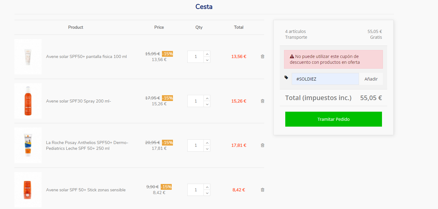 PD: Esto es importante porque si el cliente solo mete en el carrito productos que estén rebajados, con el cupón de descuento serán demasiados descunetos ya...