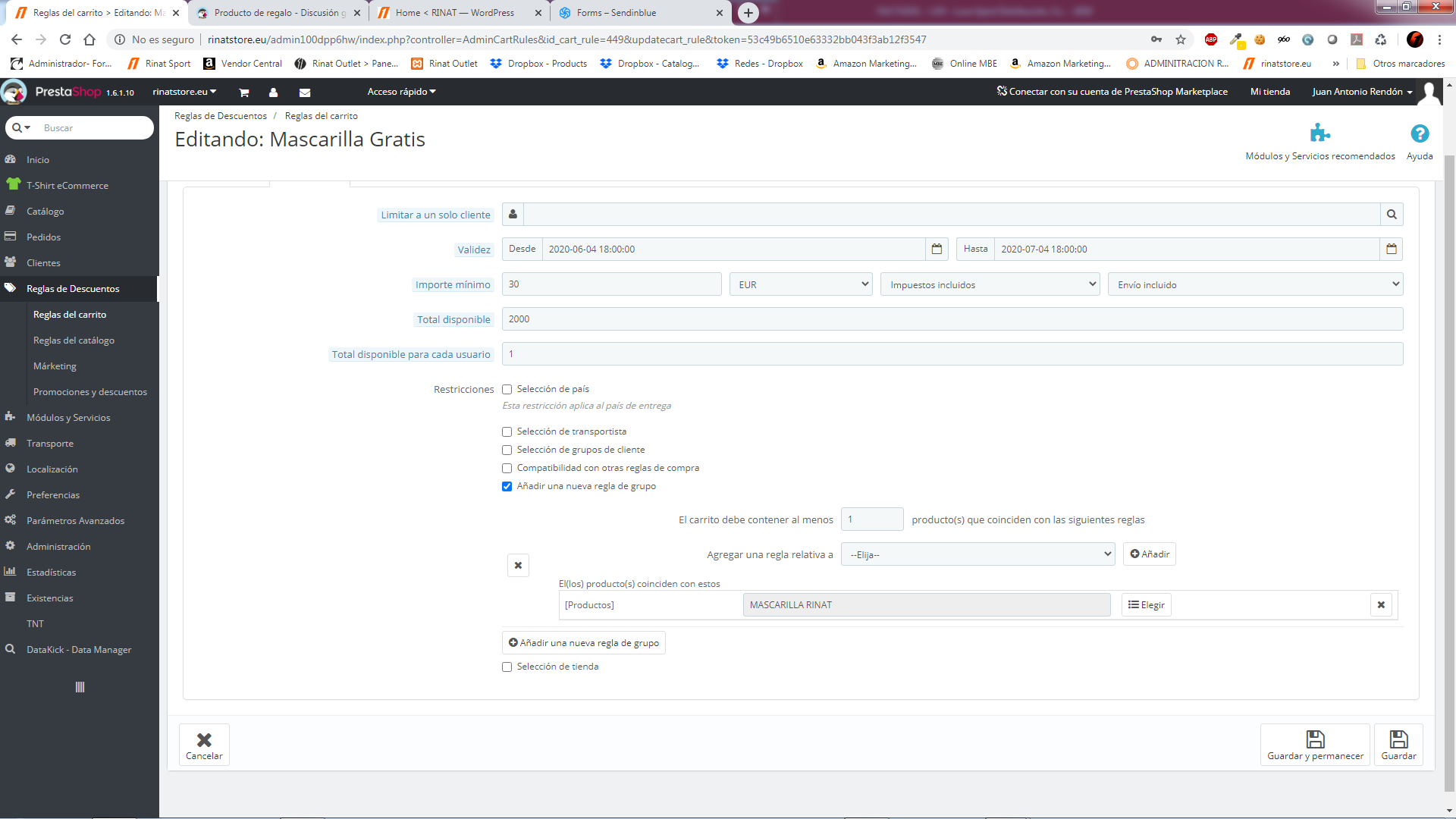 rdngrafico Posted June 8, 2020 Author Share Posted June 8, 2020 Con la herramienta Reglas de Carrito lo hice, sin crear código para que se hiciera de forma genérica. En las condiciones indiqué 1 unidad por cliente, y para un producto específico. Pero al hacer las pruebas, descontaba todas las unidades de ese producto. Por favor, si me pudieras indicar el paso a paso te lo agradecería, no vaya a ser que no lo esté configurando bien. Por cierto, mi versión de Prestashop es 1.6.1.10 Muchas gracias Link to comment Share on other sites More sharing options...