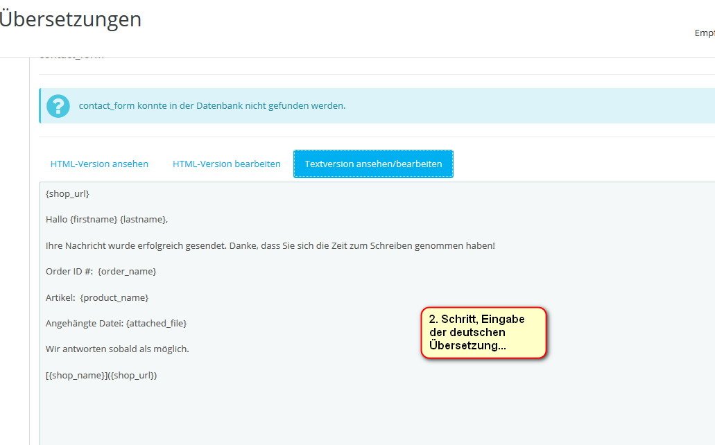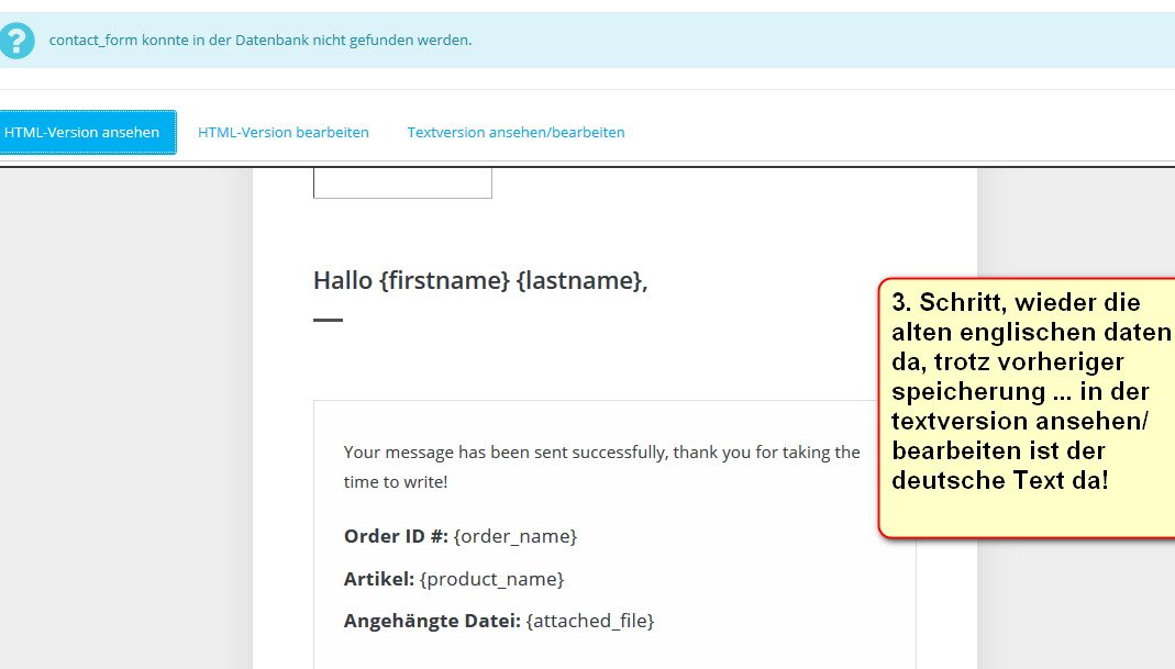 Tanjafeuer Posted June 8, 2020 Share Posted June 8, 2020 Grüss euch! hoffentlich kann mir jemand helfen. Ich will die emails, die ich bekomme, wenn ich eine bestellung gemacht habe, ändern. Habe schon Stunden verbracht, hier mit der Suchfunktion und bin darauf gekommen, dass man bei Übersetzungen / übersetzungen emails / email body / programm / deutsch das ändern kann (siehe screenshot). Wenn ich dann auf "vordefinierte Emails" und "bearbeiten" gehe, bei "textversion ansehen und bearbeiten" die (englischen) Texte ändere, speichere, rausgehe, wieder reingehe, dann sehe ich bei "HTML-Version" immer noch die alte (auf englisch). bei der "textversion anshen und bearbeiten" aber die, die ich geändert habe (deutsch).... was mache ich falsch?? Link to comment Share on other sites More sharing options...