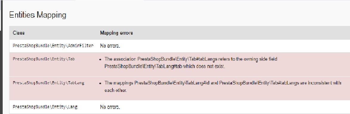 NaturalShop1 Posted June 9, 2020 Share Posted June 9, 2020 Buenos días, Me han aparecido estos dos errores. Mi nivel con Prestashop es bajo... Tengo que tocar alguna línea en el Php? Si alguien ha tenido el mismo error o sepa como resolverlo se agradece una ayudita 1. PrestaShopBundle\Entity\Tab The association PrestaShopBundle\Entity\Tab#tabLangs refers to the owning side field PrestaShopBundle\Entity\TabLang#tab which does not exist. 2. PrestaShopBundle\Entity\TabLang The mappings PrestaShopBundle\Entity\TabLang#id and PrestaShopBundle\Entity\Tab#tabLangs are inconsistent with each other. PrestaShopBundle\Entity\LangNo errors. Link to comment Share on other sites More sharing options...