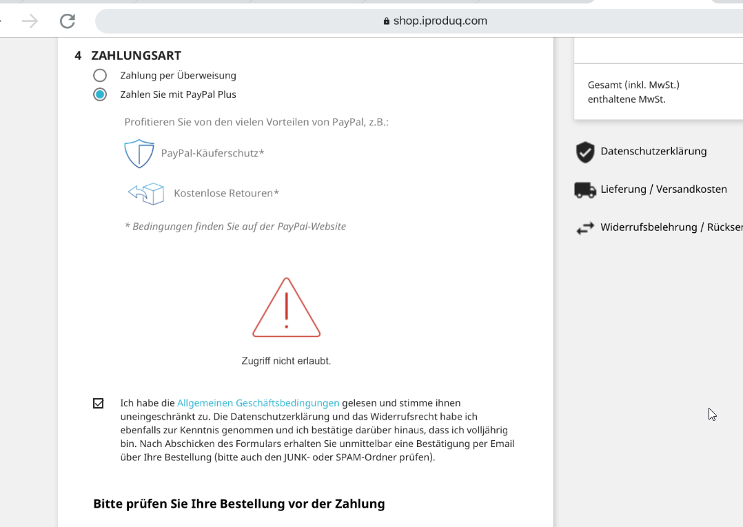 [email protected] Posted June 9, 2020 Share Posted June 9, 2020 (edited) Hallo Zusammen, ich brauche dringend Eure Hilfe! Der Express-Checkout funktioniert ohne Probleme und das Geld kommt auch richtig an - daraus folgere ich - dass es nicht an Paypal oder an der Verknüpfung liegen kann! Wenn ich aber über die Kasse rausgehe und Paypal als Zahlungsmittel auswähle - dann werde ich nicht weitergeleitet - siehe auch Bilder unten! Wer hat eine Idee woran es liegen kann? Ich habe es auch schon von verschiedenen Browsern und Rechnern versucht und auch die Browser-Caches vorher brav gelöscht! Danke vorab für Eure Tipps. BG Markus ... Express-Checkout über den "gelben Paypal-Button" geht: Weiterleitung an Paypal über Kasse geht nicht: Edited June 15, 2020 by [email protected] (see edit history) Link to comment Share on other sites More sharing options...