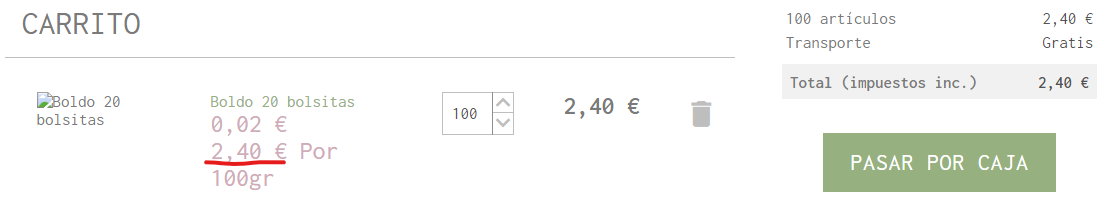 elenaso Posted September 22, 2020 Author Share Posted September 22, 2020 Creo que PrestaShop calcula el precio unitario que se muestra en la web a partir del precio del producto, que ya está redondeado, aunque no lo tengo muy claro. En mi caso, por si le sirve a alguien, la SOLUCIÓN que adopté fue modificar los .tpl necesarios para que cuando hay un producto con precio unitario (productos por peso o por metro), visualmente muestre al usuario el precio por la unidad indicada y no el precio del producto. De modo que se vería así: He contemplado también los descuentos, tanto por % como fijos. Los .tpl a modificar (estoy trabajando con la plantilla por defecto, si trabajas con otra puede que varíe) son estos: > Añadir un mensaje encima de la cantidad que ponga "Seleccione los gramos": /themes/TU_TEMA/templates/catalog/_partials/producto-add-to-cart.tpl > Listado de productos por categoría: /themes/TU_TEMA/templates/catalog/_partials/miniatures/product.tpl > Vista previa: /themes/TU_TEMA/templates/catalog/_partials/product-prices.tpl > Ficha producto: /themes/ TU_TEMA /templates/catalog/_partials/product-prices.tpl > Añadir al carrito: /themes/ TU_TEMA /modules/ps_shoppingcart/modal.tpl > Carrito: /themes/ TU_TEMA /templates/checkout/_partials/cart-detailed-product-line.tpl > Pedido confirmado: /themes/ TU_TEMA /templates/checkout/_partials/order-confirmation-table.tpl > Mi cuenta -> mis pedidos (cuando no permite devoluciones): /themes/ TU_TEMA /templates/customer/_partials/order-detail-return.tpl > Mi cuenta -> mis pedidos (cuando permite devoluciones): /themes/ TU_TEMA /templates/customer/_partials/order-detail-no-return.tpl > Mi cuenta -> devoluciones de mercancía: / themes/ TU_TEMA /templates/customer/order-return.tpl > Para las label que se muestran sobre las fotos (tema descuentos): /themes/ TU_TEMA /templates/catalog/_partials/product-flags.tpl > En el proceso de pago: /themes/TU_TEMA/templates/checkout/_partials/cart-summary-product-line.tpl Te dejo algunas variables que usé para calcular el precio unitario: $product.reduction $product.unit_price_ratio $currency.sign $product.unity $product.specific_prices.reduction_type $product.price_without_reduction ... Creo que no me olvidé de ningún tpl. A mayores, modifiqué el número que aparece en el carrito, para que no muestre que has comprado 1000 artículos, cuando lo que has comprado es 1kg de arroz (1000gr), para esto, modifiqué los siguientes tpl para mostrar {$cart.products|count}, que es el número de artículos diferentes (o lo que es lo mismo, número de líneas): > En el icono del carrito (arriba a la derecha siempre visible): /themes/TU_TEMA/modulos/ps_shoppingcart/ps_shoppingcart.tpl > En el modal al añadir al carrito: /themes/TU_TEMA/modulos/ps_shoppingcart/modal.tpl > En el resumen del carrito (proceso de pago): /themes/TU_TEMA/templates/checkout/_partials/cart-detailed-totals.tpl > En el resumen del carrito (proceso de pago): /themes/TU_TEMA/templates/checkout/_partials/cart-summary.tpl Si a alguien le sirve, ahí queda eso. Link to comment Share on other sites More sharing options...