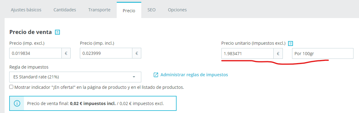elenaso Posted June 10, 2020 Share Posted June 10, 2020 (edited) Tengo un producto simple (sin combinaciones) con estos precios: En la pestaña Precios tengo estos precios configurados, ya que es un producto que se vende por gramos: El problema está en que en la web, cuando estoy viendo la ficha del producto, no muestra el precio unitario indicado en la pestaña precios, sino que redondea este precio tanto que sale un precio erróneo: Sin embargo, en el carrito sale correctamente este precio: He revisado el código y en ambos archivos product-prices.tpl y cart-detailed-product-line.tpl están mostrando el dato $product.unit_price_full, sin embargo en algún sitio se está haciendo un redondeo cuando se va a mostrar en la ficha. ¿Esto es un bug o está así hecho aposta por algún motivo? ¿Dónde tendría que modificarlo? Gracias! Edited September 22, 2020 by elenaso Solucionado (see edit history) Link to comment Share on other sites More sharing options...