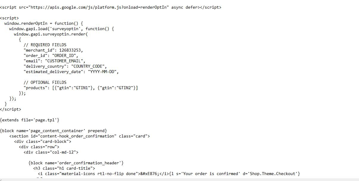 idnovate.com Posted June 12, 2020 Share Posted June 12, 2020 Ese código de Google lo has puesto tú, verdad? Para solucionar el problema deberías envolverlo en la etiqueta {literal}: {literal} //Tu código {/literal} Pero ten en cuenta que ese código no está bien, tienes que transformar las variables ORDER_ID, CUSTOMER_EMAIL, etc. en los valores correctos. 1 Link to comment Share on other sites More sharing options...