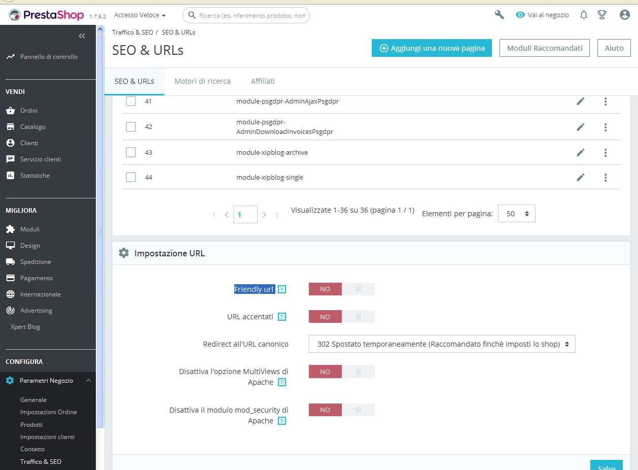 Maurizio Milioni Posted June 18, 2020 Author Share Posted June 18, 2020 Non c'è nessuno che può aiutarmi? Ripeto non riesco a creare un link ad una pagina o una categoria tipo: "caffe.com/macchine-caffe". Il link che esce è questo: https://caffe.com/index.php?id_category=9&controller=category Sono andato sul BlackOffice e ho cercato di impostare su SI la casella Friendly URL ma quando vado a salvare le impostazioni mi da una serie di errori (come in foto). Inolte ho sostituito una foto nella pagina prodotti, categoria Macchine caffè, e le impostazioni grafiche del prodotto si sono spostate, come potete vedete da foto allegate. Cosa posso fare per risolvere i due problemi? Grazie Link to comment Share on other sites More sharing options...