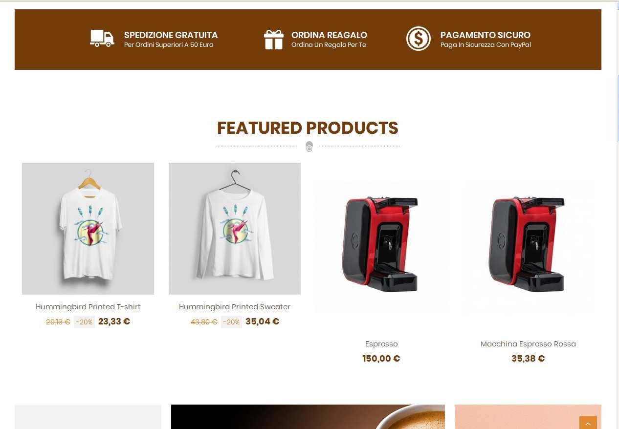 Maurizio Milioni Posted June 15, 2020 Share Posted June 15, 2020 (edited) Un saluto a tutti!!!! Salve sono nuovo di questo forum e nell'utilizzo di Prestashop. Sto cercando di realizzare un sito web per un amico che ha una torrefazione. Abbiamo acquistato un tema qui su Prestashop e ce lo siamo fatti installare. Fin qui tutto bene. Sono riuscito, dopo vari rompicapo, ad effettuato anche alcune variazioni sulla home page, sia grafiche che di testi. Quando però sono andato a sostituire un prodotto inserendo anche una foto di una macchina per il caffè, praticamente il riquadro che era quadrato è diventato rettangolare perdendo l' impostazione originale. Eppure chiedeva soltanto di inserire una foto 800x800 che ho caricato e sostituire i testi. Non solo ma mi è sparito anche l'effetto collegato al passaggio del mouse. Quest'ultimo sono poi riuscito a riattivarlo mentre la foto ha cambiato impostazioni. Oggi poi sono andato a mettere il link della pagina "chi siamo" ad una delle immagini dello slider nella home page. Cosa semplicissima mi sono detto. Non l'avessi mai pensato, il link non funziona. Mi da errore, "pagina inesistente". Tutto il pomerigio ho cercato su internet qualche soluzione ma niente. Sicuramente sarò io che sono alle prime armi e Prestashop mi risulta troppo complicato e forse c'è da fare qualche impostazione che non ho fatto. Cerco qualche amico più esperto che gentilmente mi suggerisca come poter risolvere questi problemi. Sono anche disponibile a dare le credenziali per il Backoffice se qualcuno fosse disponibile a dare un'occhiata per vedere se ci sono errori da correggere. Grazie anticipatamente. Buona serata Edited June 15, 2020 by Maurizio Milioni (see edit history) Link to comment Share on other sites More sharing options...