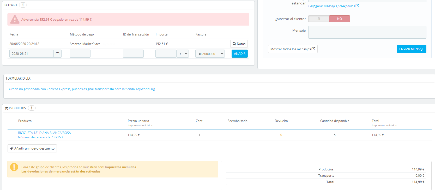 gusman126 Posted June 20, 2020 Share Posted June 20, 2020 (edited) Hola a todos. Estoy intentando añadir un pedido por medio de webservice, pero obligando los precios de los productos. He podido añadir todo, cliente, direccion, carrito, y pedido, Cuando voy a enviar el pedido añado las lineas de productos obligando el precio : <order_rows> <order_row> <id>0</id> <product_id>8510</product_id> <product_attribute_id>0</product_attribute_id> <product_quantity>1</product_quantity> <product_name>GORMITI S2 - BLISTER HERALDS VALUE PACK</product_name> <product_reference>GRE06000</product_reference> <product_ean13>8056379082132</product_ean13> <product_isbn></product_isbn> <product_upc></product_upc> <product_price>17.35</product_price> <unit_price_tax_incl>20.990000</unit_price_tax_incl> <unit_price_tax_excl>17.350000</unit_price_tax_excl> </order_row> </order_rows> El problema esta en que al enviar el pedido, la respuesta y por lo tanto al guardar en la tienda , se guardan con los precios internos de prestashop <order_rows nodeType="order_row" virtualEntity="true"> <order_row> <id>37</id> <product_id>8510</product_id> <product_attribute_id>0</product_attribute_id> <product_quantity>1</product_quantity> <product_name>GORMITI S2 - BLISTER HERALDS VALUE PACK</product_name> <product_reference>GRE06000</product_reference> <product_ean13>8056379082132</product_ean13> <product_isbn/> <product_upc/> <product_price>13.214876</product_price> <unit_price_tax_incl>15.990000</unit_price_tax_incl> <unit_price_tax_excl>13.214876</unit_price_tax_excl> </order_row> </order_rows> </association> Puedo añadir el "total paid y total products" <total_paid>20.990000</total_paid> <total_paid_tax_incl>20.990000</total_paid_tax_incl> <total_paid_tax_excl>17.350000</total_paid_tax_excl> <total_paid_real>0.000000</total_paid_real> <total_products>17.350000</total_products> <total_products_wt>20.990000</total_products_wt> Y eso si que me lo respeta <total_paid>20.990000</total_paid> <total_paid_tax_incl>20.990000</total_paid_tax_incl> <total_paid_tax_excl>17.350000</total_paid_tax_excl> <total_paid_real>0.000000</total_paid_real> <total_products>17.350000</total_products> <total_products_wt>20.990000</total_products_wt> El problema que tengo es que en la tienda da un error de pago Alguna solución?? Edited February 4, 2021 by gusman126 (see edit history) Link to comment Share on other sites More sharing options...