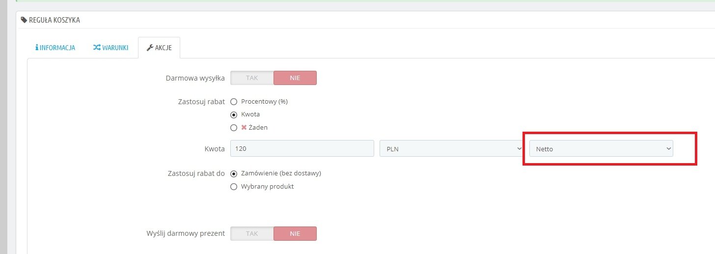 w akcjach ustawiam, ze ma być kwotowy a nie procentowy, wpisuje ze kwota 120 zł, ustawione jest netto - bo nie jestem płatnikiem VAT