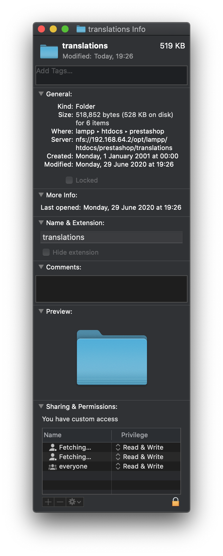mmbar Posted June 29, 2020 Share Posted June 29, 2020 Hi all, I'm installing Prestashop for the first time locally (Mac OS + XAMPP) and had a few errors at the "System compatibility" stage. Many of the "Recursive write permissions" were solved by changing the access rights to each folder, with the exception of the "~/translations/" folder. I have changed the permissions (as show in the screenshot) but nothing happens. Tried to restart the apache server from the XAMPP GUI, still nothing. Anything I'm missing here? Thanks Link to comment Share on other sites More sharing options...