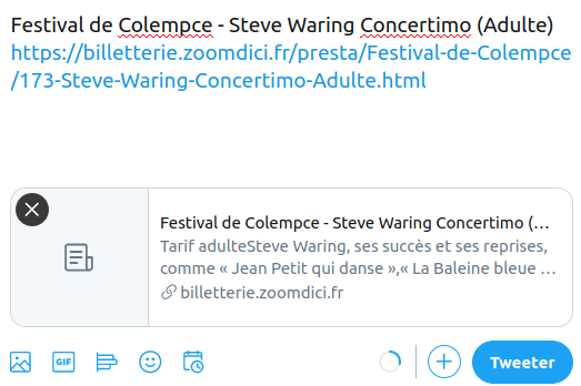 tilito Posted July 2, 2020 Author Share Posted July 2, 2020 (edited) Je suis d'accord avec les exemples Cependant j'ai essayé de partager sur tweeter 2 des sites que vous avez fait, mais sur aucun des 2 cela fonctionne. Il n'y a que l'url et le titre qui sont présents (pas image, ni description). Peut-être que vous n'avez pas utiliser votre module sur ces sites. Auriez vous un URL à me faire parvenir pour que je test ? Merci de l'attention que vous portez à mes posts. EDIT: Effectivement quand je copie-colle l'URL celà fonctionne, mais sur mon site aussi. Ce que je veux c'est que quand on clique sur le bouton "partager" (quelque soit le réseau) toutes les options de OpenGraph soient inclu dans le message (ou tweet, enfin vous comprenez). Edited July 2, 2020 by tilito (see edit history) Link to comment Share on other sites More sharing options...
