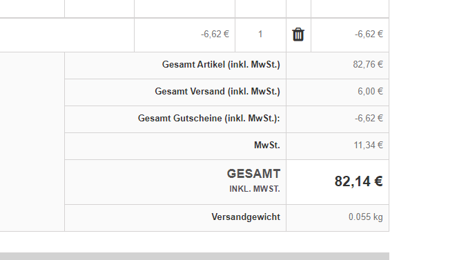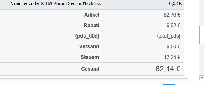 Claudiocool Posted July 3, 2020 Share Posted July 3, 2020 (edited) Hallo zusammen, ich hab ein kleines Problem: Wenn jemand normal bestellt (also ohne Rabatte etc.) wird in der Bestellmail der korrekte Betrag für die Umsatzsteuer ausgegeben, passt also. Sind jetzt aber rabattierte Artikel (hier 8% auf bestimmte Artikel anläßlich einer Forenaktion) dabei, wird die Umsatzsteuer so angegeben, als wären alle Artikel zum Normalpreis rausgegangen, der Rabatt wird bei der Steuerberechnung nicht ermittelt. Wo wird diese Berechnung vorgenommen, sprich, wo wäre der Hebel hier anzusetzen? Das ist der Warenkorb, hier wird es mit einem korrekt angezeigt, also richtig berechnet Und das spuckt die Mail an mich aus.... PS: Ich weiß nicht, warum der die Bilder doppelt anzeigt, ich habe versucht, die Dubletten rauszulöschen, geht aber nicht... Edited July 3, 2020 by Claudiocool (see edit history) Link to comment Share on other sites More sharing options...