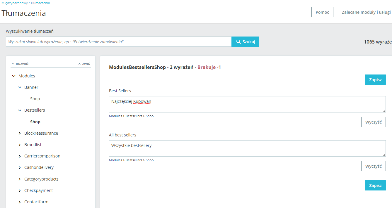 nie działa możliwość zmiany tłumaczenia w sklepie tekstu przez opcję Międzynarodowy->Tłumaczenia->Tłumaczenia Szablonów