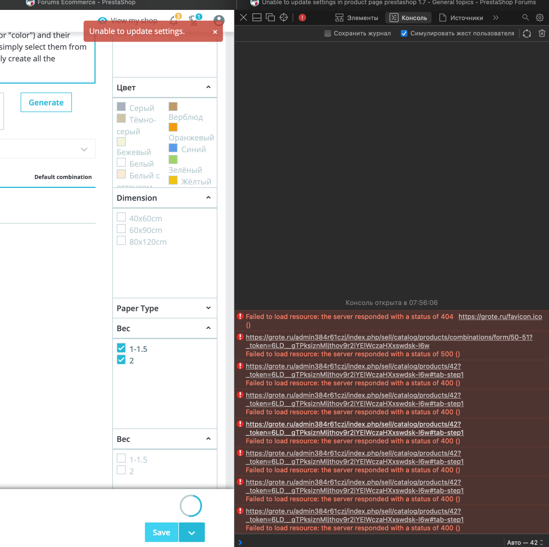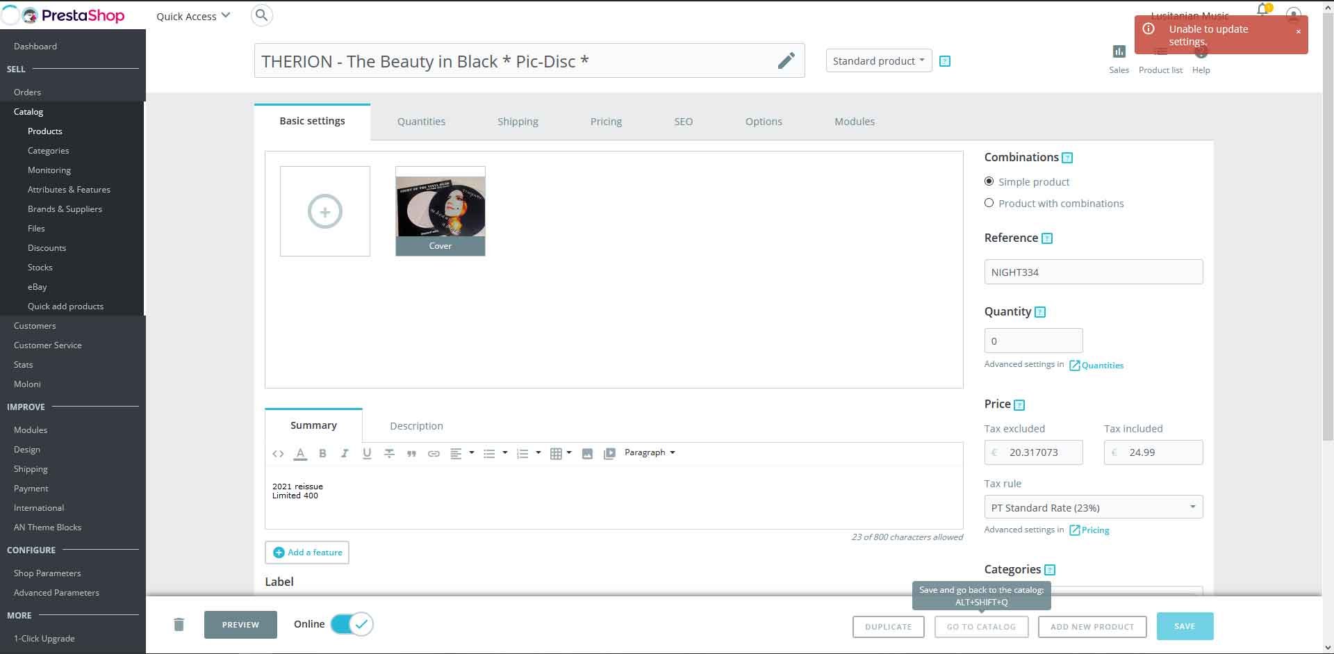 haitam.chtiba@gmail. Posted July 7, 2021 Share Posted July 7, 2021 (edited) Hi ! I'm facing actually the same problem, i can't update or save modification on product page everytime i get this message : "Unable to update settings" Can anyone please tell me how to fix that ? - PrestaShop : 1.7.7.1 - Version de PHP : 7.3.28 Screenshot of error https://take.ms/ytkui Thank you in advance Edited July 7, 2021 by haitam.chtiba@gmail. (see edit history) Link to comment Share on other sites More sharing options...
