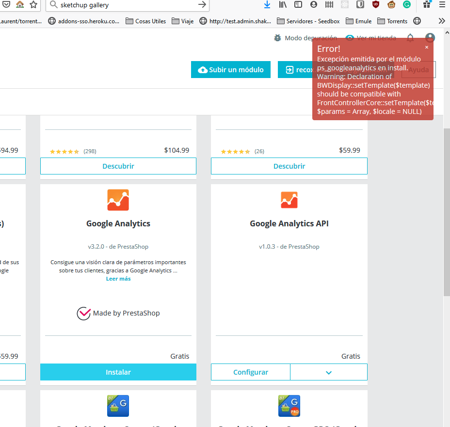 Adrián de Grafreak Posted July 13, 2020 Share Posted July 13, 2020 Aemás el plugin que intentabas instalar solo es compatible con la 1.6 Deberías utilizar este https://github.com/PrestaShop/ps_googleanalytics Link to comment Share on other sites More sharing options...