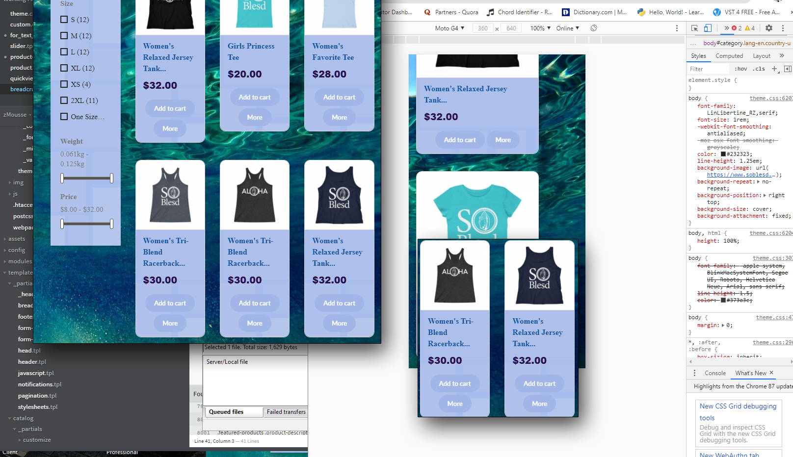 ZORANVEDEK Posted December 7, 2020 Share Posted December 7, 2020 Here's what I am trying to accomplish: You'll note that in the medium size it switches to a smaller thumbnail view, but when it goes to mobile size it switches back to the larger thumbnails. I fail to see the logic in that and it seems a bit backwards in my mind. Why not go one step smaller, or just keep the smaller size? I can get the thumbnails to go smaller on mobile but nothing I do is allowing them to sit side by side. I am pretty sure the code I need is in templates/catalog/_partials/miniatures/product.tpl and is on lines 26-30 and is as follows: {if $page.page_name == 'index' || $page.page_name == 'search'} {$col = 'col-xs-12 col-sm-6 col-md-3'} {else} {$col = 'col-xs-12 col-sm-6 col-md-4'} {/if} ...but again, nothing I do is allowing them to sit side by side, and I think it might be a padding or margin issue somewhere else, but I can't find where, and I'm currently at a loss as to what to do here. If someone could point me in the right direction that would be great. Thanks in advance. Link to comment Share on other sites More sharing options...