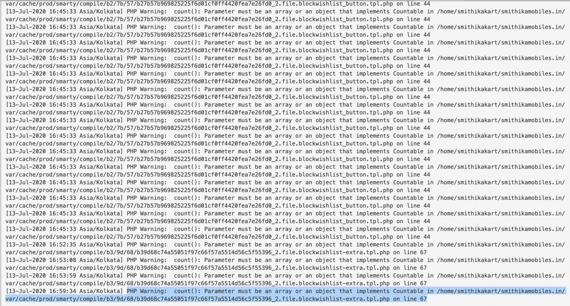 Smithikakart Posted July 13, 2020 Share Posted July 13, 2020 hey i have installed block wishlist module getting PHP Warning: count(): Parameter must be an array or an object that implements Countable in error here is the log any one help me to fix,error logs getting over load bcos this warnings....... PHP Warning: count(): Parameter must be an array or an object that implements Countable in /home/smithikakart/smithikamobiles.in/var/cache/prod/smarty/compile/b3/9d/68/b39d68c74a55051f97c66f57a5514d56c5f55396_2.file.blockwishlist-extra.tpl.php on line 67 Link to comment Share on other sites More sharing options...