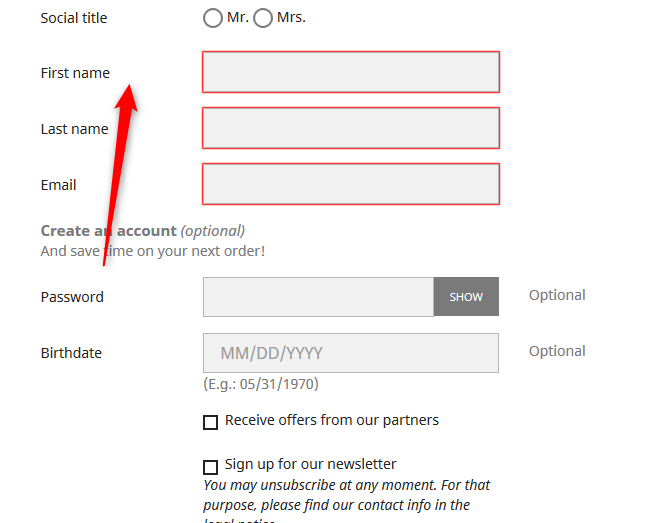 w standardzie formularz rejestracji klienta ( prestashop 1.7 ) nie pokazuje które pola są obowiązkowe do wpisania. Dopiero po kliknięciu kontynuuj, by przejść dalej do wpisania adresu dostawy system pokazuje informację, które pola są obowiązkowe do wypełnienia. Chciałbym by na stronie rejestracji klienta np przy wyborze pól obowiązkowych imienia, nazwiska, email, adresu, itp dopisać gwiazdkę (*) z informacją pole obowiązkowe, tak jak np pojawia się w polach nieobowiązkowych tekst "Optional". W którym pliku szukać by dopisać takie zmiany ?