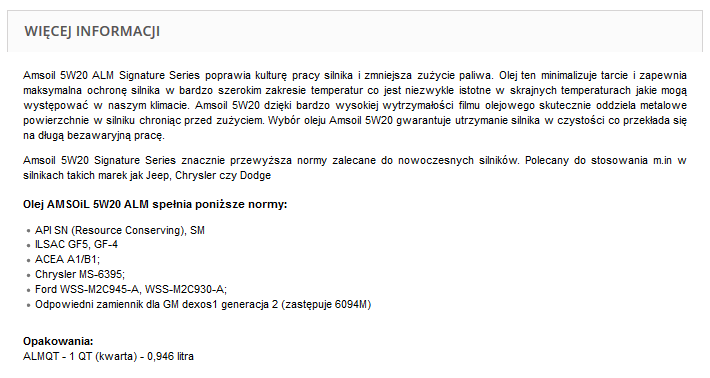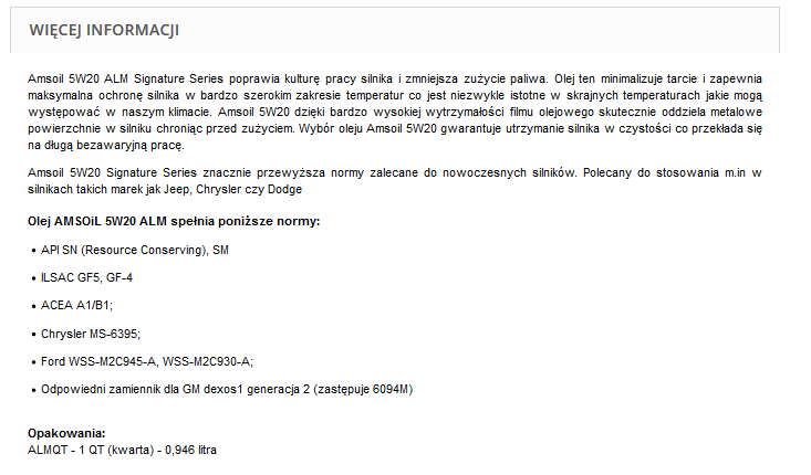krzysiek_web Posted July 16, 2020 Share Posted July 16, 2020 Formatowanie nie może rozwalać bo tam jest tylko zmiana koloru. Przykładowo: https://chemiasamochodowa24.pl/pl/oleje/91-amsoil-5w30-olej-do-dpf.html Mamy normalne formatowanie. Przez przypadek nie usunąłeś jakiegoś kodu/klamry itd? Podaj link do produktu gdzie jest problem. Link to comment Share on other sites More sharing options...