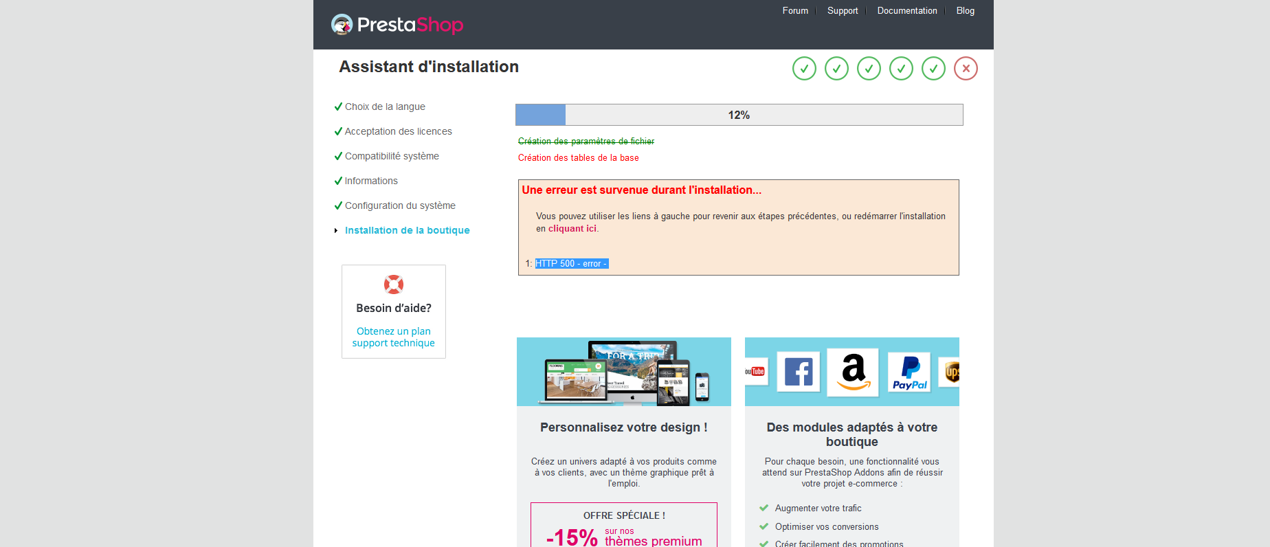 foldi3 Posted July 16, 2020 Share Posted July 16, 2020 Bonsoir à tous J'essaye d'installer prestashop chez infomaniak. J'ai tout rentré correctement vérifier plusieur fois la connection à ma bdd fonctionne et j'ai l'erreur suivante qui apparait dès la création de tables, quelqu'un aurait une solution ? Car meme le support d'infomaniak m'a dit que sa pouvait venir de plusieurs choses et ne savent pas trop 😞 ""Super" Merci d'avance Julien Link to comment Share on other sites More sharing options...