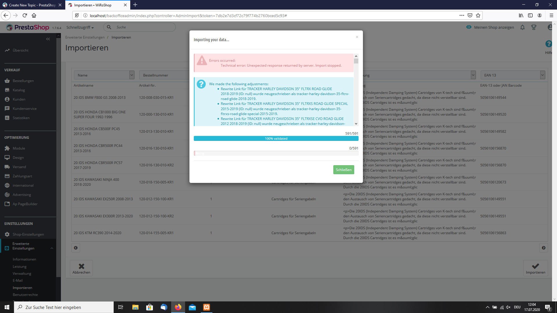 Pete80 Posted July 17, 2020 Share Posted July 17, 2020 Hallo Leute ! Prestashop Seit einem Datenbank crash vor wenigen Tagen , versuche ich ein Problem zu lösen , Ohne Erfolg. Die alte Datenbank auf meinem localen Xampp Server funktionierte nicht mehr und ich musste über ein backup die Datenbank neu einspielen. Das Problem war allerdings , dass das backup 2 Wochen alt war. Hatte dann einige Probleme das Ding wieder zum Laufen zu bringen , konnte allerdings aller wieder hinbekommen bis auf eine Sache. Beim Produktimport über eine csv Datei , gibt er mir einen ServerError . siehe Anhang . Ignoriere ich die Spalte der Bilder URLs beim Import funktioniert es einwandfrei. Nehme ich die Bilder wieder rein , bekomme ich wieder diesen Servererror. Das witzige ist, dass er jedesmal genau 5 Artikel (auch die Bilder) korreckt anlegt !? Wenn ich den Debug Modus aktiviere, dann funktoniert der Import auch mit Bildern ohne Probleme (ca. 500 Produkte) . Der Apache error.log zeigt folgendes an : [Fri Jul 17 12:02:56.214678 2020] [php7:notice] [pid 17212:tid 1956] [client ::1:55964] PHP Notice: Undefined property: Product::$image_alt in D:\\Wiroshop\\htdocs\\controllers\\admin\\AdminImportController.php on line 2242, referer: http://localhost/backofficeadmin/index.php?controller=AdminImport&token=7db2e7d3cf72c79f774b2760bced5c93 [Fri Jul 17 12:02:58.080231 2020] [php7:notice] [pid 17212:tid 1956] [client ::1:55964] PHP Notice: Undefined property: Product::$image_alt in D:\\Wiroshop\\htdocs\\controllers\\admin\\AdminImportController.php on line 2242, referer: http://localhost/backofficeadmin/index.php?controller=AdminImport&token=7db2e7d3cf72c79f774b2760bced5c93 [Fri Jul 17 12:02:59.347354 2020] [php7:notice] [pid 17212:tid 1956] [client ::1:55964] PHP Notice: Undefined property: Product::$image_alt in D:\\Wiroshop\\htdocs\\controllers\\admin\\AdminImportController.php on line 2242, referer: http://localhost/backofficeadmin/index.php?controller=AdminImport&token=7db2e7d3cf72c79f774b2760bced5c93 [Fri Jul 17 12:03:00.573187 2020] [php7:notice] [pid 17212:tid 1956] [client ::1:55964] PHP Notice: Undefined property: Product::$image_alt in D:\\Wiroshop\\htdocs\\controllers\\admin\\AdminImportController.php on line 2242, referer: http://localhost/backofficeadmin/index.php?controller=AdminImport&token=7db2e7d3cf72c79f774b2760bced5c93 [Fri Jul 17 12:03:01.647713 2020] [php7:notice] [pid 17212:tid 1956] [client ::1:55964] PHP Notice: Undefined property: Product::$image_alt in D:\\Wiroshop\\htdocs\\controllers\\admin\\AdminImportController.php on line 2242, referer: http://localhost/backofficeadmin/index.php?controller=AdminImport&token=7db2e7d3cf72c79f774b2760bced5c93 Hab schon alles Versucht leider keinen Erfolg : Cache im Backoffice und manuell gelöscht Nicht von Prestashop entwickelte Module deaktivieren hab ich auch versucht , leider das selbe . Execution Time bzw. Timeout auf hohe Werte gesetzt . Vielleicht könnt Ihr mir da weiter helfen . Link to comment Share on other sites More sharing options...