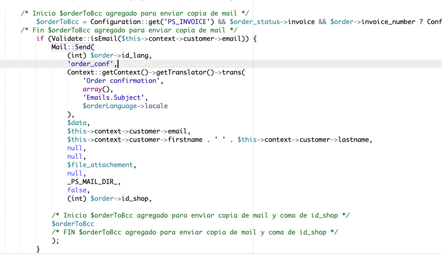 ventura Posted July 26, 2020 Share Posted July 26, 2020 Lo mas practico seria hacerlo desde classes/PaymentModule.php En la function validateOrder, antes de esta parte if (Validate::isEmail($this->context->customer->email)) { Mail::Send( (int) $order->id_lang, 'order_conf', ........... se añade $orderToBcc = Configuration::get('PS_INVOICE') && $order_status->invoice && $order->invoice_number ? Configuration::get('PS_SHOP_EMAIL') : null ; Mas abajo, en ... null, _PS_MAIL_DIR_, false, (int) $order->id_shop después de (int) $order->id_shop añadimos una coma y debajo ponemos la variable creada anteriormente, quedando así esa parte (int) $order->id_shop, $orderToBcc De esta manera se recibirá en el email establecido como email de la tienda en CONFIGURAR / Contacto - Datos de Contacto - Dirección de correo electrónico de la tienda la copia del email que recibe el cliente con la factura adjunta cuando un pedido es valido y se ha emitido factura Link to comment Share on other sites More sharing options...