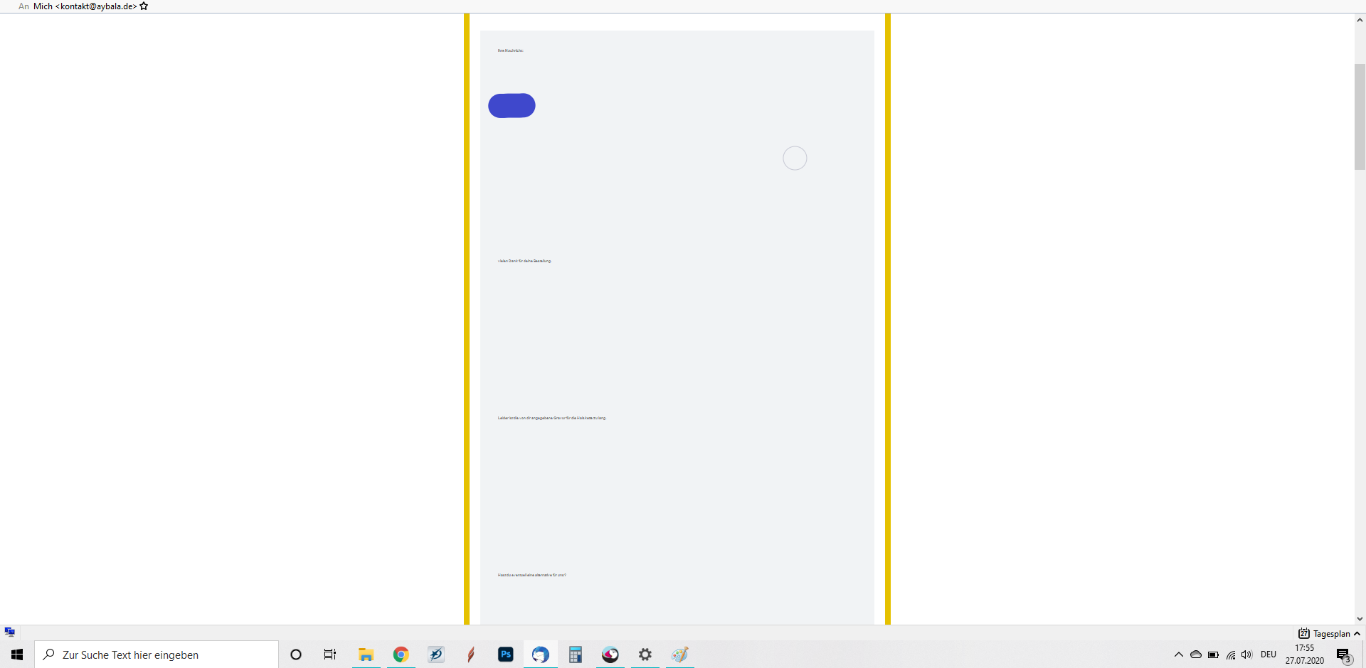 Habe es bewusst herausgezoomt, damit der genannte Fehler deutlicher zu sehen ist. Es geht einfach um die riesigen Zeilenabstände. Es handelt sich hier um die eingehenden und ausgehenden Nachrichten, die aus dem Backoffice im Prestashop versendet werden - es wurden schon mehrere Mailprogramme sowohl auf dem PC, alsauch auf dem Smartphone ausprobiert- das Ergebnis ist leider immer gleich.