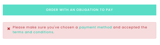 mbarnils Posted July 29, 2020 Share Posted July 29, 2020 (edited) Hi, Hope you can help me out here Whenever I'm checking out on my website, after choosing the payment method and accepting the terms and conditions, the button "Order with obligation to pay" is disabled. The error message is: "Please make sure you've chosen a payment method and accepted the terms and conditions." but this is all done. Do you know how to solve it? Thank you very much! Edited July 29, 2020 by mbarnils tags (see edit history) Link to comment Share on other sites More sharing options...