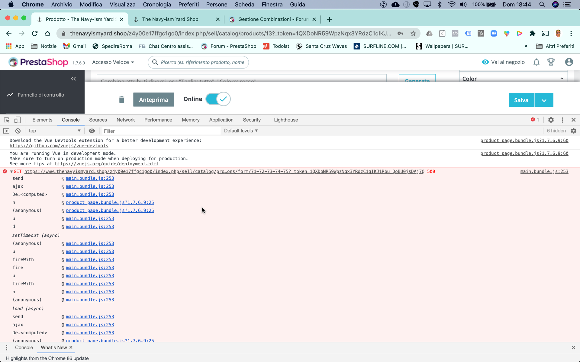 Surfil Posted December 6, 2020 Share Posted December 6, 2020 (edited) 18 minutes ago, cleoni said: Ciao, ti conviene aprire la console Javascript di Chrome (sul pc si fa Shift J, sul mac penso qualcosa di simile) e vedere se nella console vedi dei messaggi di errore. Talvolta per motivi tecnici può non venire caricato qualche script o si possono essere generati degli errori sulle chiamate che la pagina esegue per far apparire le combinazioni. Grazie mille per la tua risposta Cleoni. Ho seguito il tuo consiglio e si vede un'errore, ti chiedo ancora aiuto perchè non saprei come risolvere. In allegato lo screenshot dell'errore, da cosa può dipendere? Errore esteso: - main.bundle.js:253 -GET "percorso sito" 500 [email protected]:253 [email protected]:253 De.<computed>@main.bundle.js:253 n@product_page.bundle.js?1.7.6.9:25 (anonymous)@product_page.bundle.js?1.7.6.9:25 [email protected]:253 [email protected]:253 setTimeout (async) (anonymous)@main.bundle.js:253 [email protected]:253 [email protected]:253 [email protected]:253 [email protected]:253 [email protected]:253 [email protected]:253 (anonymous)@main.bundle.js:253 load (async) [email protected]:253 [email protected]:253 De.<computed>@main.bundle.js:253 (anonymous)@product_page.bundle.js?1.7.6.9:25 [email protected]:253 [email protected]:253 setTimeout (async) (anonymous)@main.bundle.js:253 [email protected]:253 [email protected]:253 (anonymous)@main.bundle.js:253 [email protected]:253 [email protected]:253 [email protected]:253 e.default@product_page.bundle.js?1.7.6.9:25 (anonymous)@product_page.bundle.js?1.7.6.9:55 [email protected]:253 [email protected]:253 setTimeout (async) (anonymous)@main.bundle.js:253 [email protected]:253 [email protected]:253 [email protected]:253 [email protected]:253 [email protected]:253 [email protected]:253 [email protected]:253 Edited December 6, 2020 by Surfil (see edit history) Link to comment Share on other sites More sharing options...