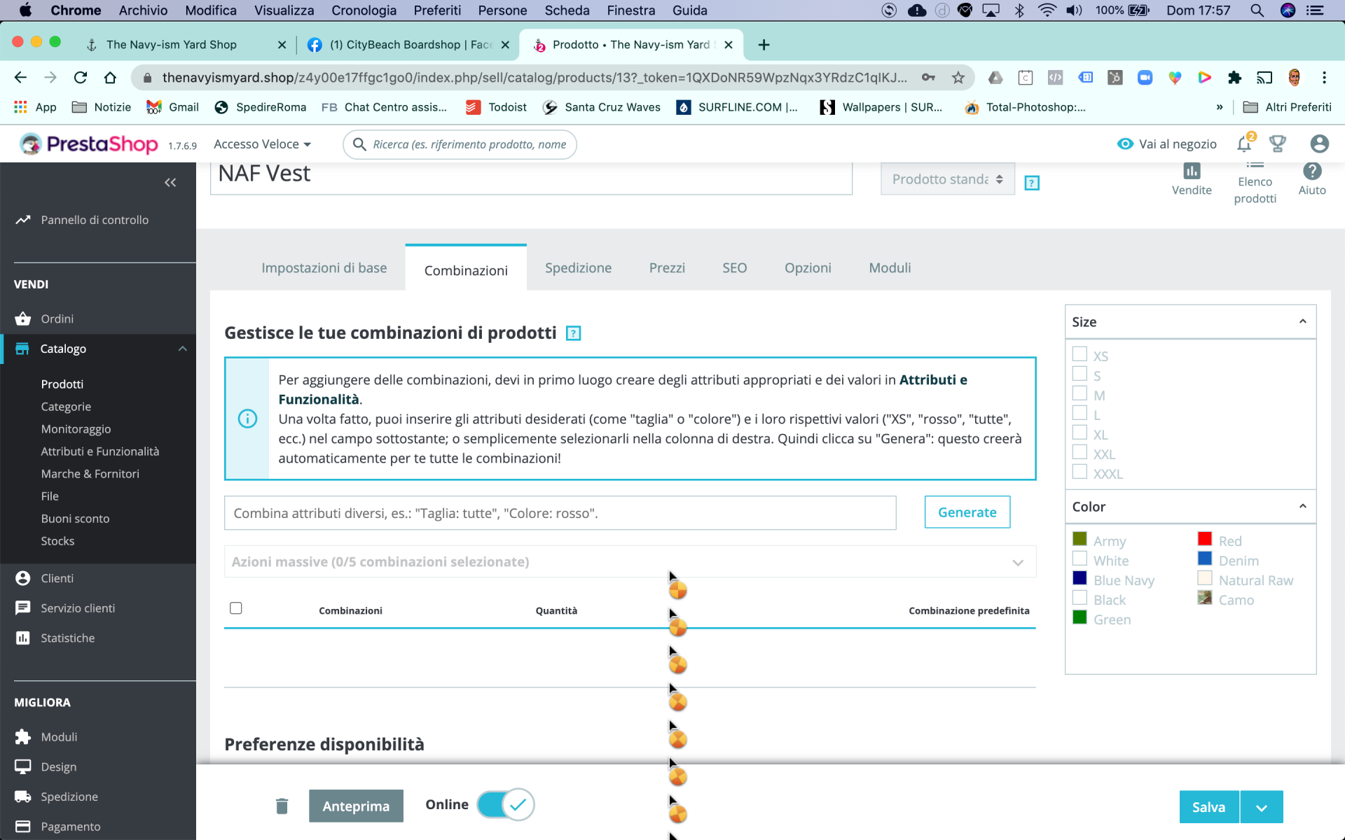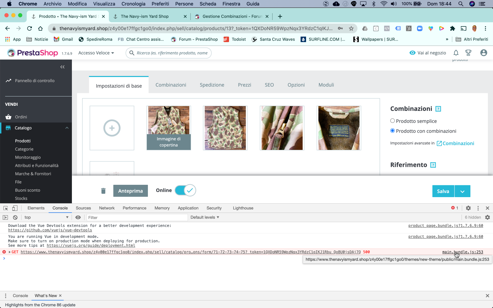 Surfil Posted December 6, 2020 Share Posted December 6, 2020 (edited) Ciao a tutti, ho un problema sulle combinazioni dei prodotti. Ho installato prestashop v 1.7.6.9 Oggi non riesco più a vedere e quindi a modificare le combinazioni, nello specifico dovrei aggiornare delle quantità taglie di un determinato articolo. L'unica modifica sostanziale che ho apportato oggi è stata quella di aver agiunto, installato e configurato il modulo ps_emailalerts. In allegato lo screenshot in cui si può vedere che le combinazioni non vengono mostrate (vale per tutti gli articoli dello store), è come se la pagina rimanesse in caricamento e non riuscisse a finire il caricamento e a mostrare le combinazioni. Può essere un bug o è dovuto a qualche modifica che magari non mi sono resoconto di aver apportato? Grazie in anticipo Edited December 6, 2020 by Surfil (see edit history) Link to comment Share on other sites More sharing options...