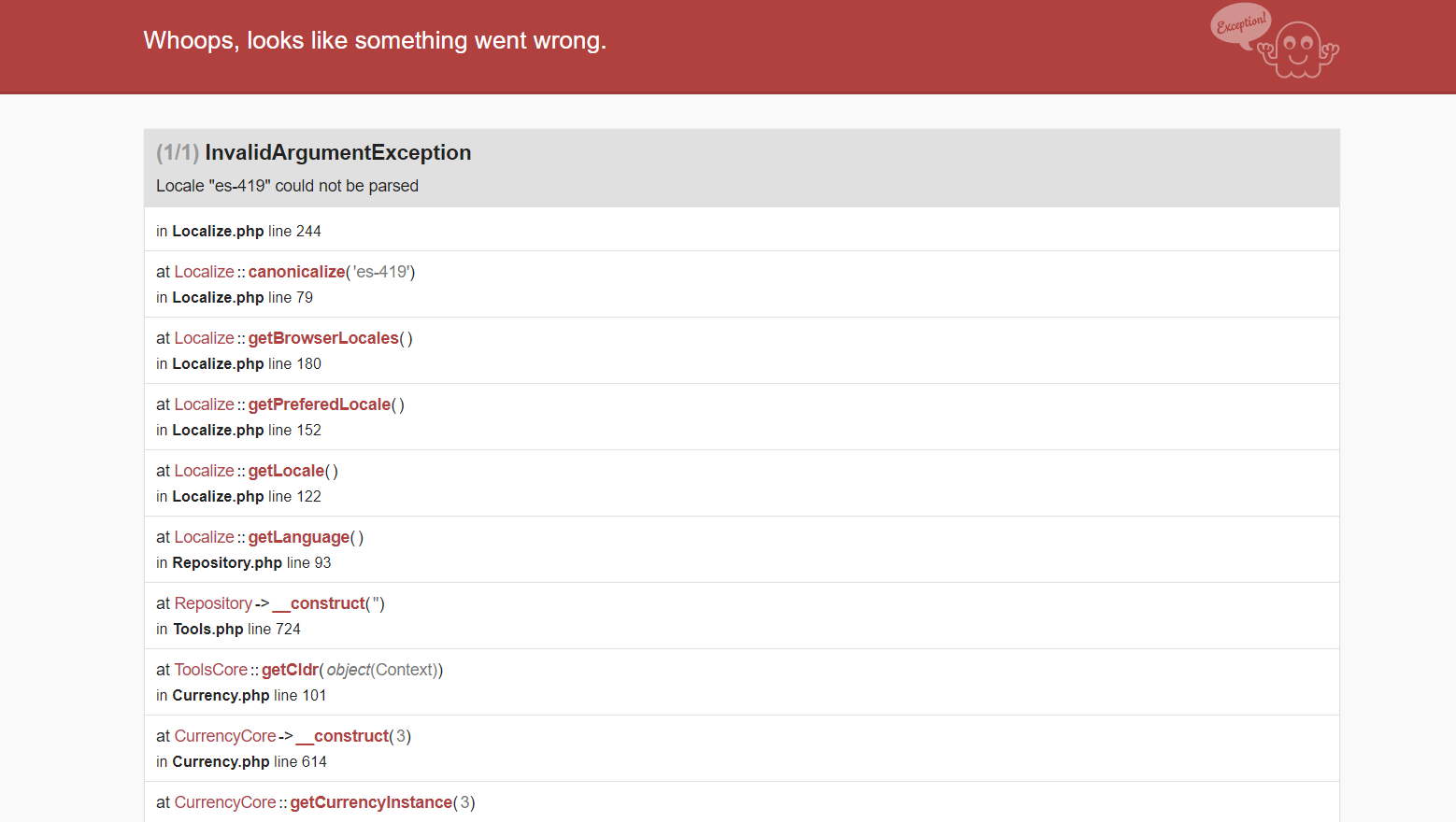 Aldo López Posted August 7, 2020 Share Posted August 7, 2020 Hola, me encontraba haciendo cambios en css y borrando caché a mi tienda pero por error olvidé desactivar una vpn gratuita del navegador y durante estos cambios (no recuerdo que región estaba), cambié el tipo de moneda de dolar a pesos mexicanos y, a su vez, el idioma de la tienda de español de españa al latinoamericano y después de esos cambios, ya no puedo acceder a la tienda normal y al backoffice. Investigué para saber que puede ser y una de las posibles soluciones era cambiar el idioma de mi navegador a otro que no sea el español de latinoamerica pero según eso solucionaba el problema localmente. También cambie las versiones de PHP, de 7.1 a 7.2 y 7.0 y el error sigue igual. Ajunto una captura y el texto del debug, ese error aparece al querer acceder a la tienda normal y al backoffice. Muchas gracias. (1/1) InvalidArgumentException Locale "es-419" could not be parsed in Localize.php line 244 at Localize::canonicalize('es-419')in Localize.php line 79 at Localize::getBrowserLocales()in Localize.php line 180 at Localize::getPreferedLocale()in Localize.php line 152 at Localize::getLocale()in Localize.php line 122 at Localize::getLanguage()in Repository.php line 93 at Repository->__construct('')in Tools.php line 724 at ToolsCore::getCldr(object(Context))in Currency.php line 101 at CurrencyCore->__construct(3)in Currency.php line 614 at CurrencyCore::getCurrencyInstance(3)in Tools.php line 682 at ToolsCore::setCurrency(object(Cookie))in FrontController.php line 350 at FrontControllerCore->init()in Controller.php line 262 at ControllerCore->run()in Dispatcher.php line 511 at DispatcherCore->dispatch()in index.php line 28 Link to comment Share on other sites More sharing options...