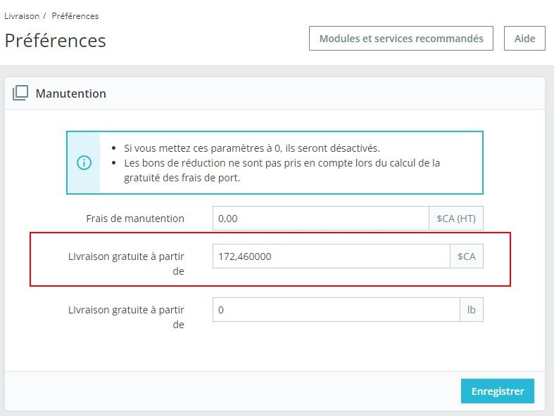 lussier.claude Posted September 16, 2022 Share Posted September 16, 2022 On 8/7/2020 at 9:52 AM, Eolia said: Il ne faut JAMAIS utiliser cette option qui n'a aucune limite sur les groupes/pays/etc (Genre vous allez vous retrouver à offrir les frais de port au Vénézuela ça m'étonnerait que votre client apprécie^^) Vous devez utiliser une règle panier. Vous pourrez choisir les dates de validité, le montant requis en HT ou TTC, les groupes clients, etc... C'est la base quand même... Bonjour, je comprend que "c'est la base" mais j'ai le même problème, je veux utiliser l'option "Livraison gratuite à partir de" 150$ CAD HT, je ne livre qu'au Canada, ici, les prix affichés sont sans taxes car chaque provinces à un taux de taxes différent, je veux utiliser cette option et non une règle de panier. Dans quel fichiers je dois chercher pour changer la variable pour utiliser le total HT ? Link to comment Share on other sites More sharing options...