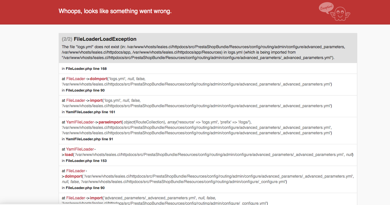 at FileLoader->doImport('logs.yml', null, false, '/var/www/vhosts/leales.cl/httpdocs/src/PrestaShopBundle/Resources/config/routing/admin/configure/advanced_parameters/_advanced_parameters.yml')in FileLoader.php line 90