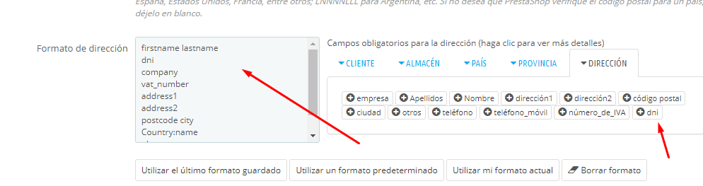 gusman126 Posted August 18, 2020 Share Posted August 18, 2020 Comprueba en Paises -> Pais > en los campos de direccion este "dni" , si no esta ahi, no se muestra en la ficha del pedido Link to comment Share on other sites More sharing options...
