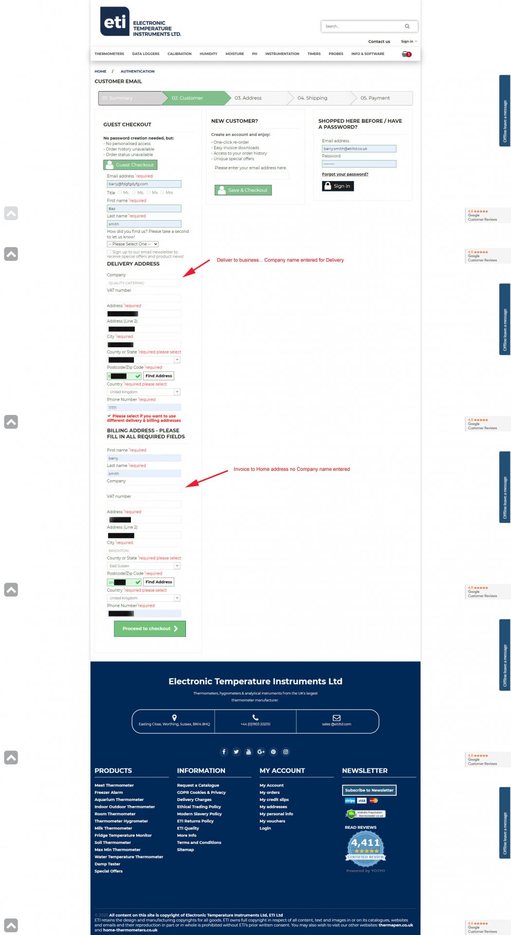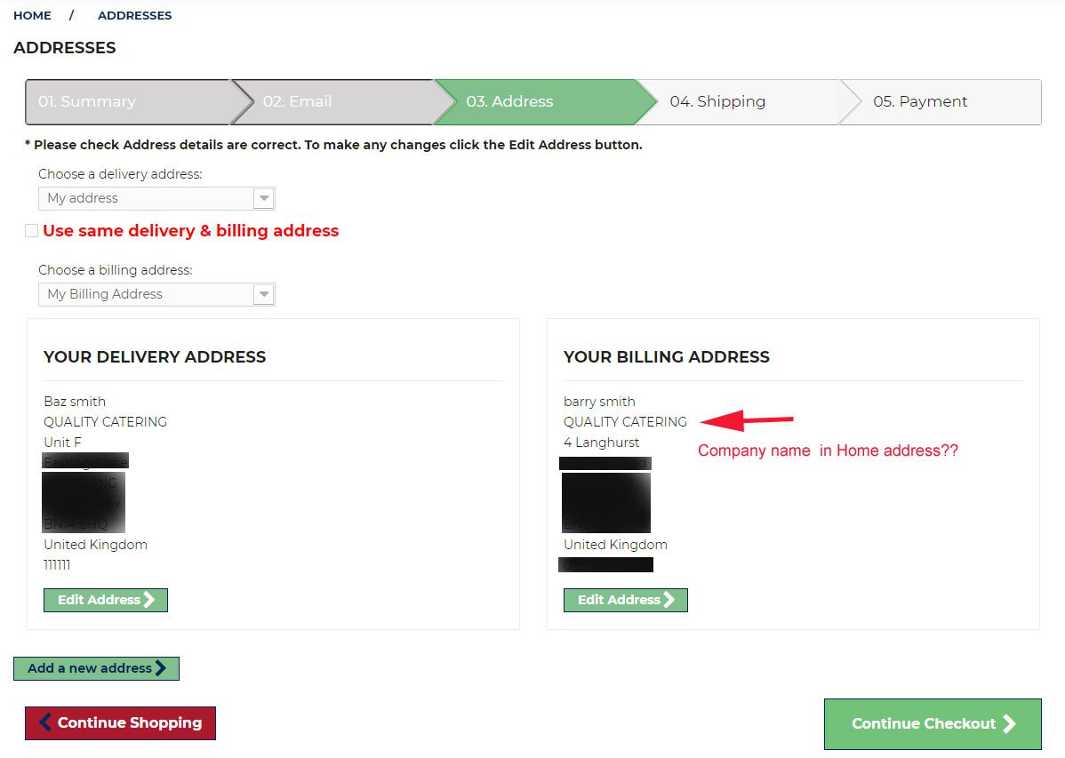 ukbaz Posted August 21, 2020 Share Posted August 21, 2020 Hi I am using Prestashop version 1.6.1.23 5 step checkout with guest checkout enabled. Have now just noticed a bug and wondered if anyone had a fix for it. When checking out as guest customer and entering a company name in delivery address, if customer click the checkbox to use separate delivery and invoice addresses and fills in the invoice address (without a company name- eg. home address) then when saving addresses to continue checkout on the next page order addresses the company name from the delivery address also appears in the invoice address as well - despite nothing being entered there. This causes problems as what is a home address appears as a company! Have attached images to demonstrate what I mean. I've spent ages trying to find out where / why this happens.... Can anyone help?? Thanks Baz Link to comment Share on other sites More sharing options...
