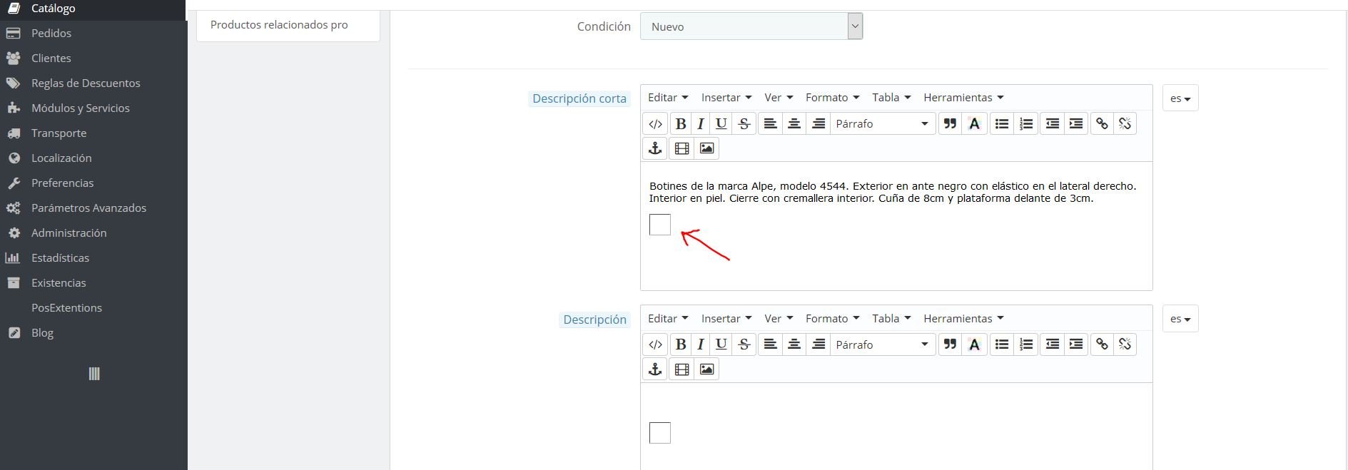 carla27 Posted August 22, 2020 Author Share Posted August 22, 2020 1 hour ago, juanrojas said: Hola, adjunta un pantallazo para ver que efectivamente el producto lo tienes en la categoria (backoofice) version de prestashop? version de PHP? Te adjunto la captura de un producto que debería estar en la categoría NUEVO. El problema es que las categorías ya ni aparecen en la página de inicio de la web. Te adjunto también la captura del error que sale cuando intento actualizar el módulo Advanced Top Menu, que creémos que es de donde viene el problema. Además, ahora cuando entro en un producto que antes estaba en web y no tenía ningún problema, ahora no me deja guardar sin haber hecho ninguna modificación y me aparece un pequeño cuadrado como imágen en la descripción. Te adjunto pantallazo tambien. La versión de prestashop es 1.6.1.24 y la de PHP la 5.6. Gracias Link to comment Share on other sites More sharing options...