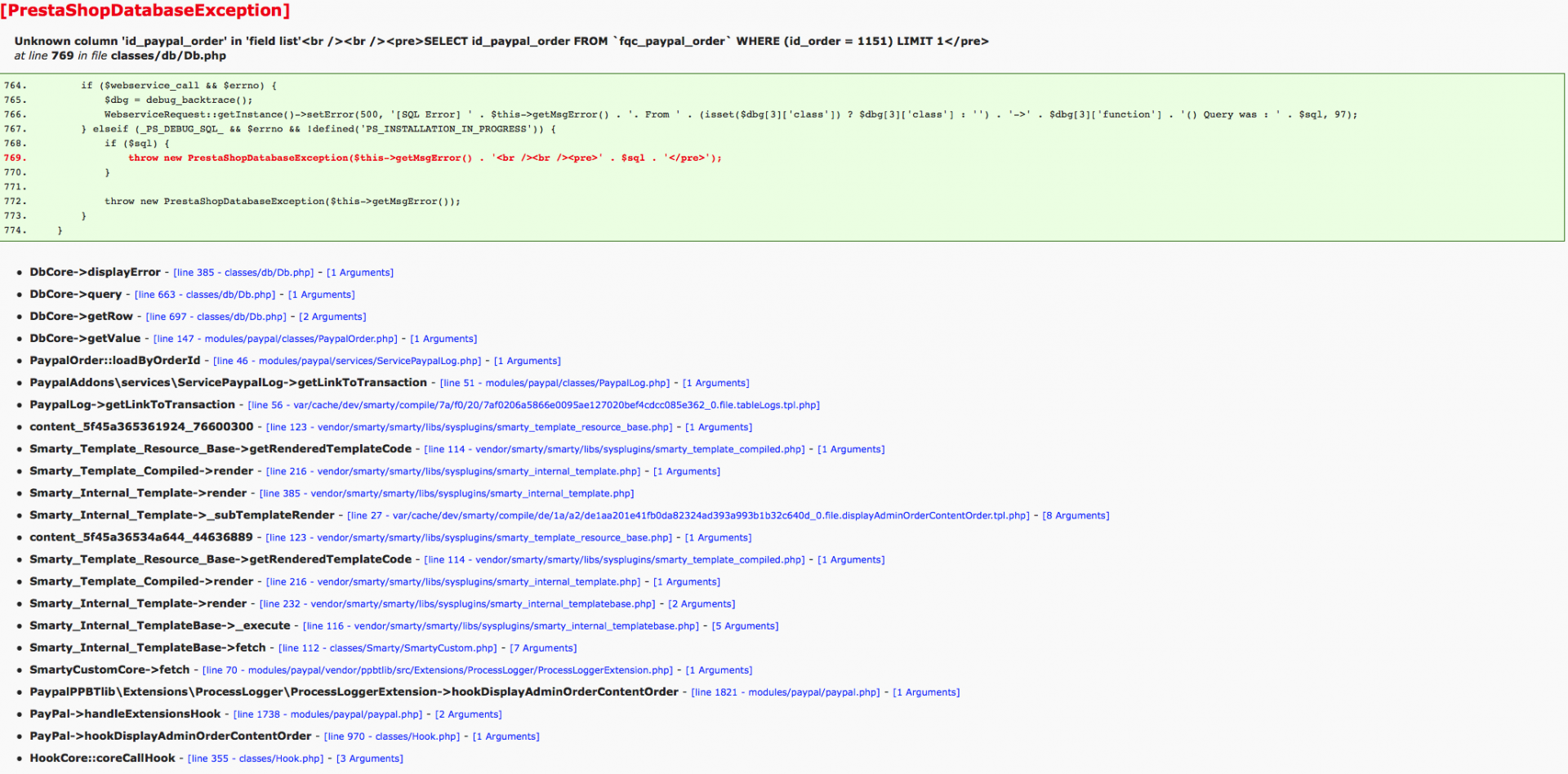 technocracy Posted August 26, 2020 Author Share Posted August 26, 2020 Ok - after a bit of debugging and looking around I have identified that the underlying issue is related to the paypal_order table. First up - I have noticed that no new records have been written to the table since the upgrade. When I enable debugging on the shop I get the following error whenever I do anything with an order or order status: Unknown column 'id_paypal_order' in 'field list'SELECT id_paypal_order FROM `fqc_paypal_order` WHERE (id_order = 1151) LIMIT 1 at line 769 in file classes/db/Db.php I posted this issue previously but at that time did not know what it was impacting since when you disable debugging the error does not reappear - so could this be an access/rights issue to the table? It seems to be something relating to that as the above error is the same regardless as whether the order in the query exists or not - in the above order no 1151 is not in the table however if I try access a record I know exists I get the same error. Anyone have any pointers on what right/permissions could be possibly missing to cause this? I have attached a full screen capture of the full error output. Thanks Link to comment Share on other sites More sharing options...