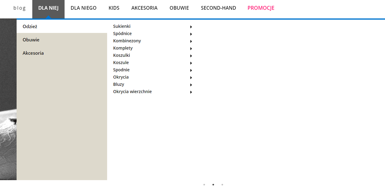 Po wybraniu jednej z opcji menu wyświetla się pierwszy poziom menu - następnie trzeba najechać myszką na jedną z pozycji aby z boku pokazał się drugi stopień.