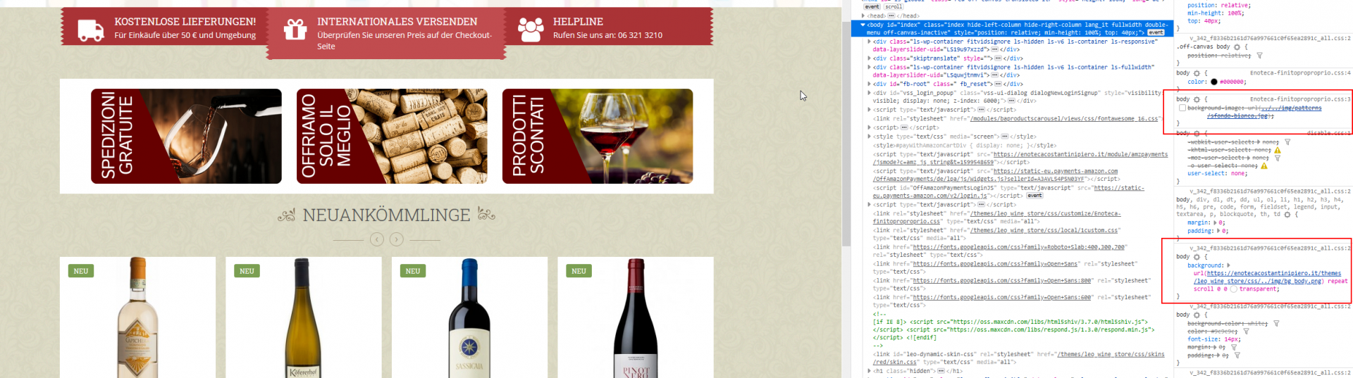 Costantini Posted September 8, 2020 Author Share Posted September 8, 2020 Just now, JBW said: The image is https://enotecacostantinipiero.it/themes/leo_wine_store/img/bg_body.png But if you delete it and it's still defined in the CSS thats even worst as the page will still try to load it but can't find it. As you are using a Leo theme there should be Ap Page Builder included - you can change/remove the background in the Ap Live Theme Editor yes there is and is already set a white background. i dont know why there is this other background setted... Link to comment Share on other sites More sharing options...