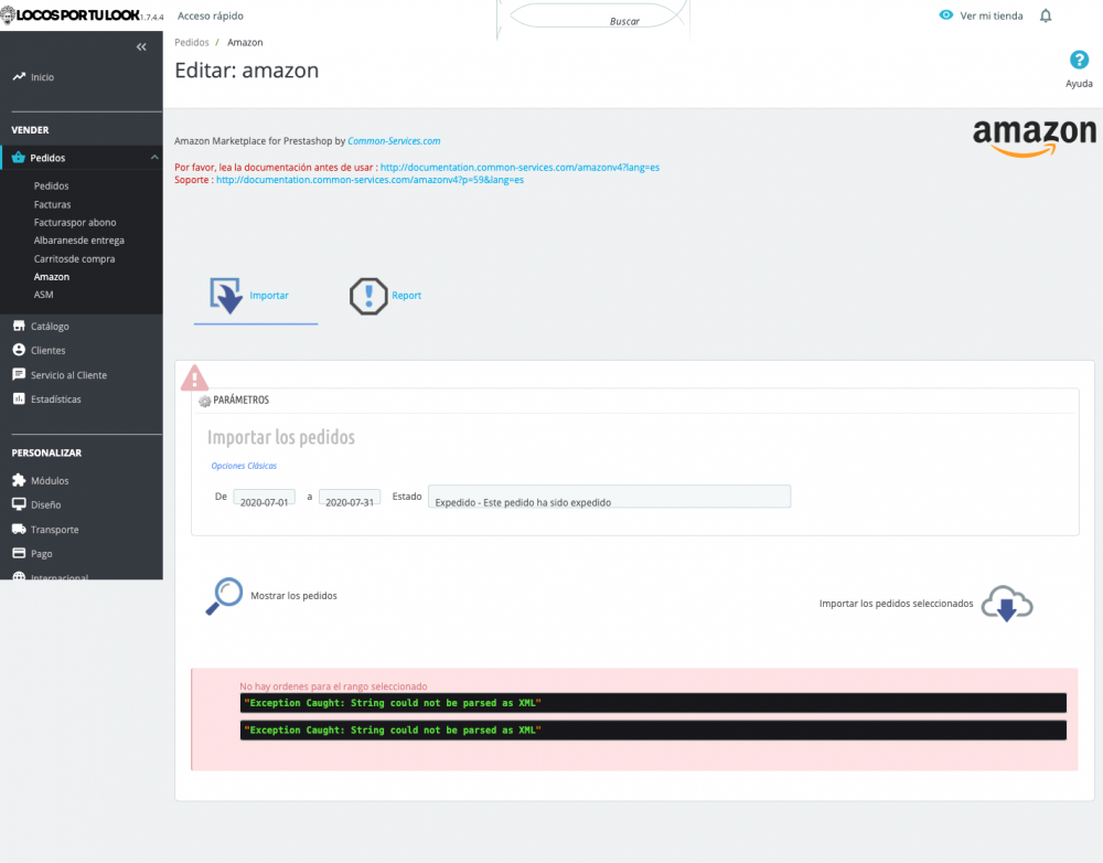 edsonrendon Posted September 8, 2020 Share Posted September 8, 2020 Hola buenas, Primera vez que hago una consulta espero me puedan ayudar, hace más de un año compre el modulo amazon para sincronizar los productos y pedidos y mas cosas, pero de un momento a otro me salio este error que les muestro en fotos, contacto con el soporte técnico del módulo y me dicen que tiene un coste de 200€ que lo veo excesivo cuando ya pague ese precio por el módulo, mi pregunta es hay alguna solucion para este error. Luego activando el modo Bug para mirar los errores me sale esto. Warning: "continue" targeting switch is equivalent to "break". Did you mean to use "continue 2"? in /homepages/2/d660983139/htdocs/prestashop/modules/amazon/classes/amazon.tools.class.php on line 830 Warning: "continue" targeting switch is equivalent to "break". Did you mean to use "continue 2"? in /homepages/2/d660983139/htdocs/prestashop/modules/amazon/classes/amazon.specificfield.class.php on line 877 Warning: "continue" targeting switch is equivalent to "break". Did you mean to use "continue 2"? in /homepages/2/d660983139/htdocs/prestashop/modules/amazon/classes/amazon.specificfield.class.php on line 879 Warning: SimpleXMLElement::__construct(): Entity: line 1: parser error : Start tag expected, '<' not found in /homepages/2/d660983139/htdocs/prestashop/modules/amazon/classes/amazon.webservice.prod.php on line 620 Warning: SimpleXMLElement::__construct(): Authentication method is outdated. Please update your software in /homepages/2/d660983139/htdocs/prestashop/modules/amazon/classes/amazon.webservice.prod.php on line 620 Warning: SimpleXMLElement::__construct(): ^ in /homepages/2/d660983139/htdocs/prestashop/modules/amazon/classes/amazon.webservice.prod.php on line 620 Link to comment Share on other sites More sharing options...