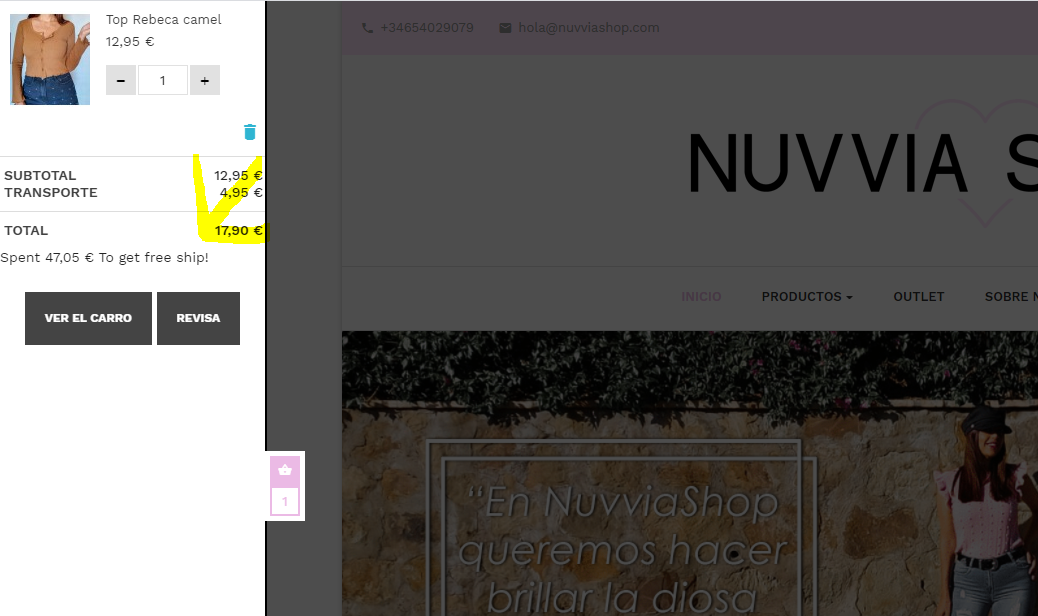 MarcosCaast Posted September 8, 2020 Share Posted September 8, 2020 Buenos días, Vuelvo aqui pidiendo socorro ante un problema que me tiene la cabeza loca jajaja. Antes de nada web: nuvviashop.com . Tema: ap_amelia El caso es que tengo un texto en el carrito, que es el texto que indica el dinero restante que necesitas añadir para que salgan gratis los gastos de envío, que no consigo traducir por ningun sitio de los ajustes del tema. A ver si alguien da con la tecla, ya sea en TPL o CSS, para traducir o al menos que desaparezca, a ver si hubiera alguna forma. Muchísimas gracias. Link to comment Share on other sites More sharing options...