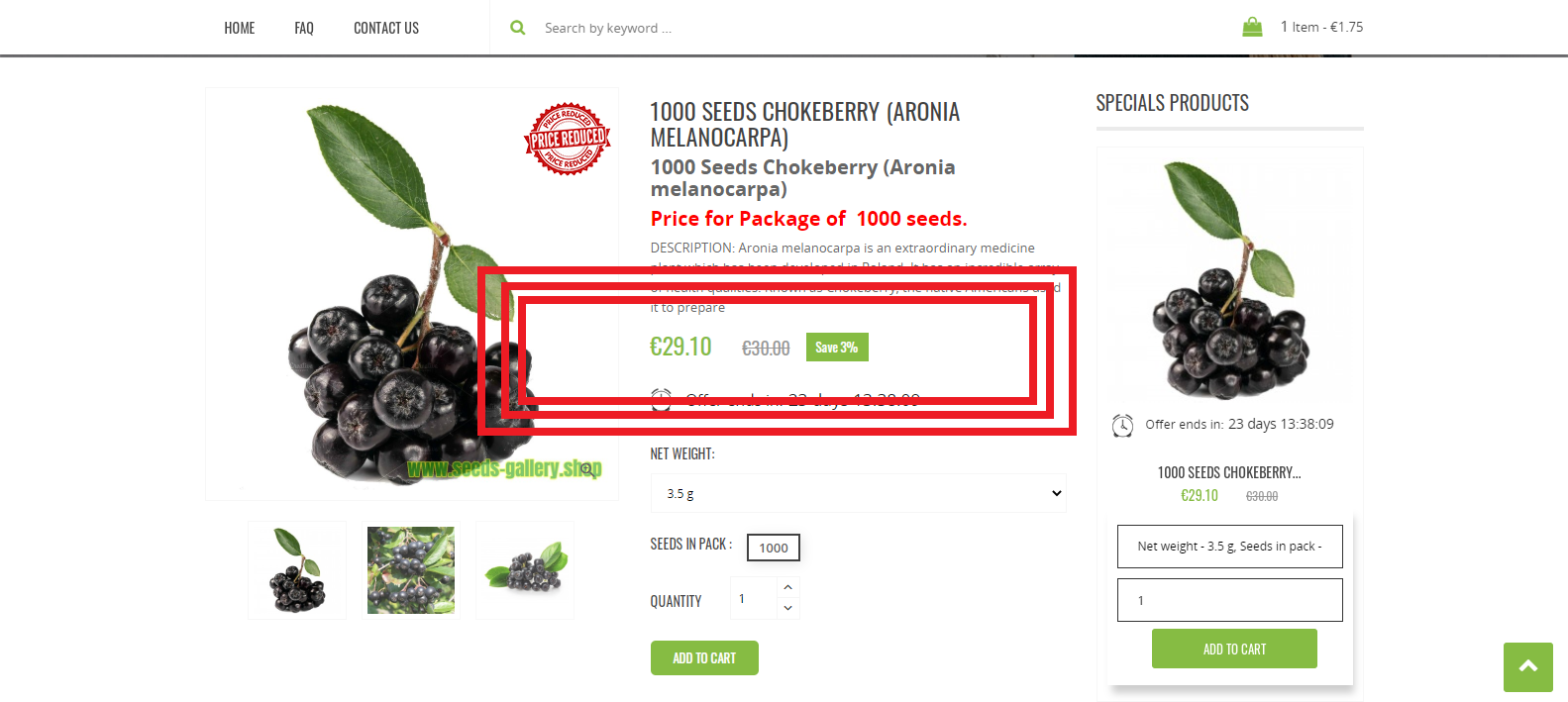 You will see 10 seeds costs €1.95, and 20 seeds costs €3.45, the price difference is between 10 and 20 seeds is €0.45, customer should see when he choose option with 20 seeds in a package is cheaper €0.45 than 10 seeds in a package "Save €0.45.