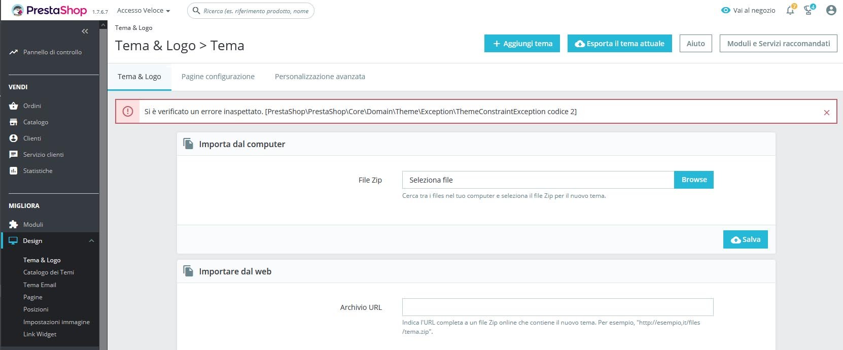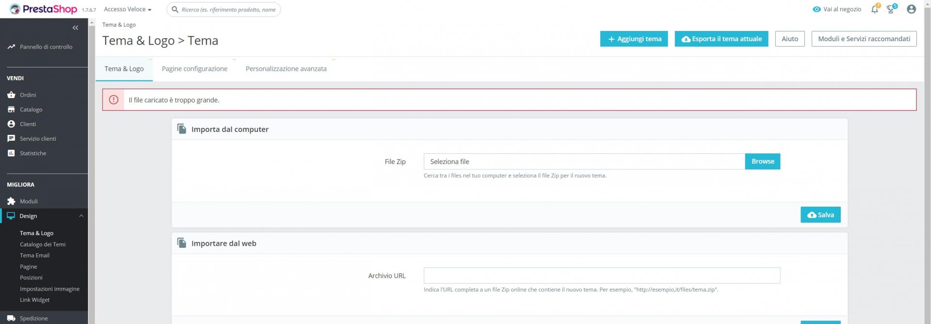 Gioro Posted September 10, 2020 Author Share Posted September 10, 2020 2 hours ago, ziobudda said: Ciao, le versione WEB e CLI di PHP possono essere diverse (come nel tuo caso) Per aggiornare prestashop ti basta sostituire i file vecchi con i nuovi. M. Si esatto, infatti sono riuscito cosi ad installare l'ultima release di Prestashop Adesso però nel tentativo di installare il template dal backoffice, mi restituisce l'errore in allegato. Cercato su google ma nulla, nessuna delle soluzioni fa al caso mio. Provato ad allegare il file zip, estrarre gli eventuali zip annidati, metterlo direttamente in cartella Themes via FTP, ma non è servito, continuo a ricevere questo errore. Sai dirmi dove agire? Link to comment Share on other sites More sharing options...