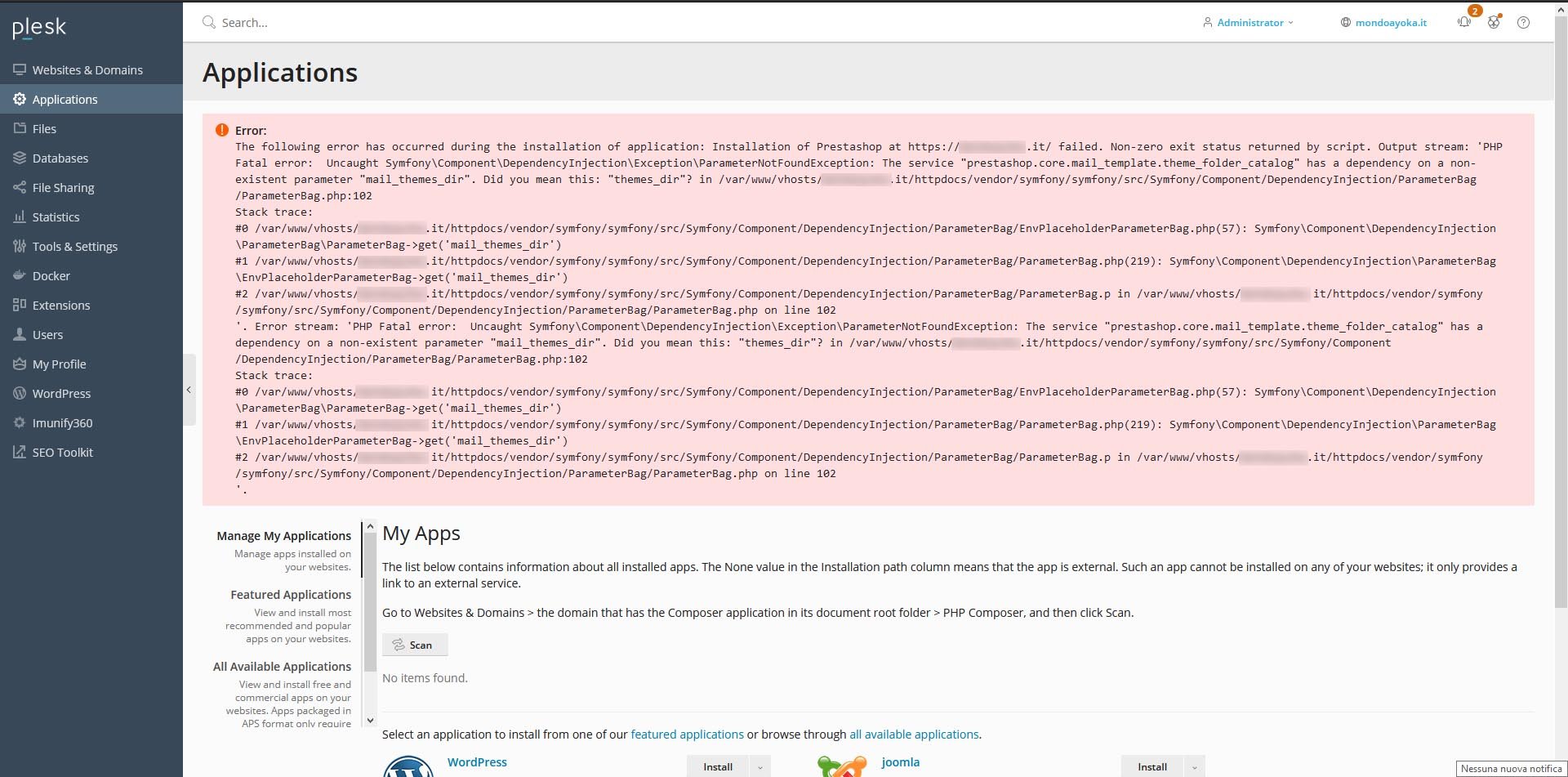 Gioro Posted September 10, 2020 Author Share Posted September 10, 2020 Vabè in sostanza, di male in peggio, non sapendo cosa fare ho eliminato i file di installazione del nuovo template via ftp e da Plesk ho disinstallato Prestashop (quello di default), ma nel tentativo di reinstallarlo, restituisce una caterva di errori (sempre da pannello plesk): Link to comment Share on other sites More sharing options...