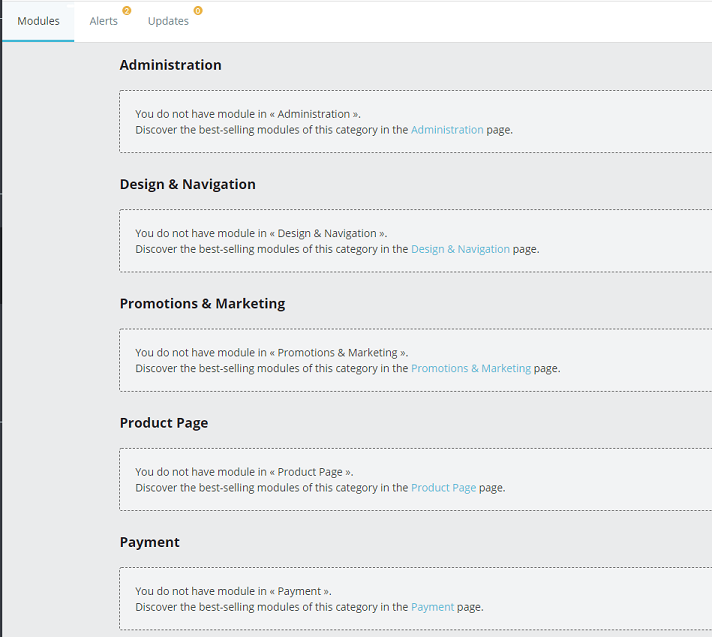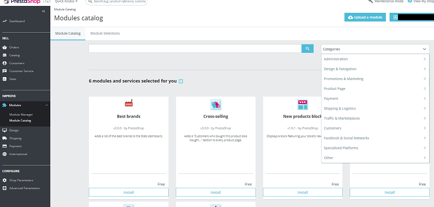 Bewitching Posted September 11, 2020 Share Posted September 11, 2020 Fresh install of ver 1.7.6.7. on a domain I use strictly for testing purposes. I am familiar with Prestashop. I have a store running 1.6xx and want to replace it with ver 1.7, hence the testing. Under module manager there are a few native modules installed, but only in the "theme modules" and "other" category. (I am logged into the addon's marketplace on the back-end, so that's not an issue.) NONE of the other categories' modules are installed. Going to the Module catalog, there are only 6 modules available to me, none of which I need, and ZERO available/showing in the needed categories. ie: admin, payment, shipping etc Looking at the attached images you can see what I mean. I went online to the Prestashop demo to see if that's the norm, meaning Prestashop 1.7 comes "barebones" with very few modules, and everything is available on the demo site's back-end module catalog. Help! Do I need to got to github to find the missing modules and download? Without a list of modules I'm not even sure what I need or what I'm missing :) Thanks! Link to comment Share on other sites More sharing options...