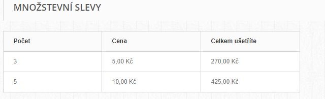 Avoknahluk Posted September 14, 2020 Share Posted September 14, 2020 Ahoj, snažila jsem se dohledat, ale tenhle problém jsem nikde nenašla. Mám u produktu co stojí 95 Kč nastavené množstevní slevy (od 3 ks je cena 90Kč/ks, od 5 ks 85 Kč/ks) a pokud na stránce produktu navolím požadovaný počet ks (třeba 3) tak místo zlevněné ceny tj. 90 Kč se ukáže -90Kč či -5Kč (podle nastavení speciální ceny). Což je pro zákazníka strašně matoucí. Navíc tabulka množstevních slev je taky podivná (jde nějak odstranit ten třetí sloupec?). Nevěděl byste si prosím někdo s tímto rady? Verze 1.6.1.18 Link to comment Share on other sites More sharing options...