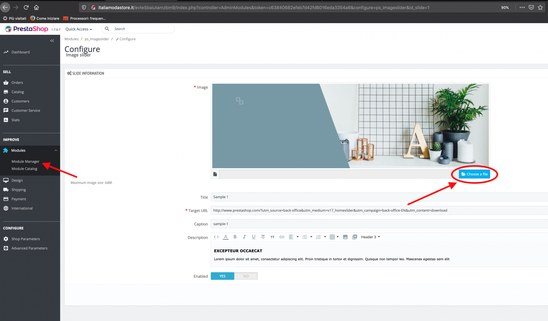 AlessandroButi Posted September 18, 2020 Share Posted September 18, 2020 Buonasera a tutti premetto che sono neofito in PrestaShop e mi scuso se le mie domande saranno magari stupide o nel topic sbagliato! Con il vostro aiuto imparerò! Ho acquistato un thema "Prestige" e l'ho installato. Tutto facile. Dopo sono andato a modificarlo e ho riscontrato che il pulsante "choose a file" nel modulo slider non funziona. posso cliccarlo mille volte ma non apre come dovrebbe la finestra di scelta. Per completezza uso Prestashop 1.7.6.7 con sistema operativo apple su Firefox (ma anche su chrome fa lo stesso). Ho provato a eliminare il Thema e continua come vedete dalla foto allegata ad avere problemi anche con il tema esempio classico. Ho cancellato cashe cambiato più di un brawser e niente da fare. Per far ripartire il bottone bisogna cancellare completamente il sito e riinstallare Prestashop da capo senza installare il Thema Prestige. Qualcuno sa dirmi qualcosa? Sapete come potrei risolvere? Grazie in anticipo a tutti Link to comment Share on other sites More sharing options...